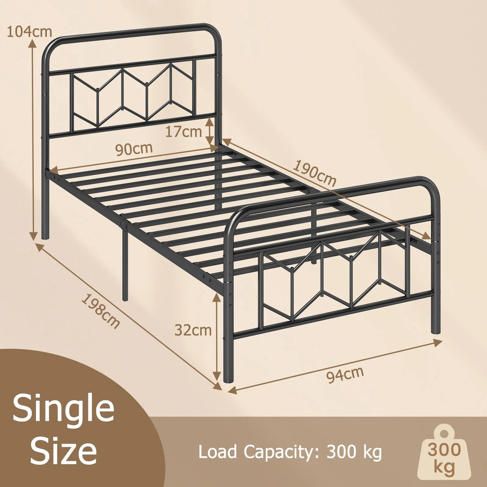 Single Size: Color: Black Material: Metal Overall Dimensions: 198 x 94 x 104 cm (L x W x H) Size of Platform Surface: 190 x 90 cm (L x W) Spacing Between Headboard and Platform Surface: 17 cm Height off the Ground: 32 cm Recommended Mattress Thickness: 20-30 cm Single Max Load Capacity: 300 kg Net Weight: 17 kg Box QTY: 1(May vary by batch) Package Includes: 1 x Single Size Platform Bed 1 x User Guide Double Size: Color: Black Material: Metal: 198 x 139 x 104 cm (L x W x H) Size of Platform Surface: 190 x 137 cm (L x W) Spacing Between Headboard and Platform Surface: 17 cm Height off the Ground: 32 cm Recommended Mattress Thickness: 20-30 cm Double Max Load Capacity: 500 kg Net Weight:22 kg Box QTY: 1(May vary by batch) Package Includes: 1 x Double Size Platform Bed 1 x User Guide King Size: Color: Black Material: Metal Overall Dimensions: 210 x 155 x 104 cm (L x W x H) Size of Platform Surface: 202 x 153 cm (L x W) Spacing Between Headboard and Platform Surface: 17 cm Height off the Ground: 32 cm Recommended Mattress Thickness: 20-30 cm King Max Load Capacity: 500 kg Net Weight: 24 kg Box QTY: 1(May vary by batch) Package Includes: 1 x King Size Platform Bed 1 x User Guide