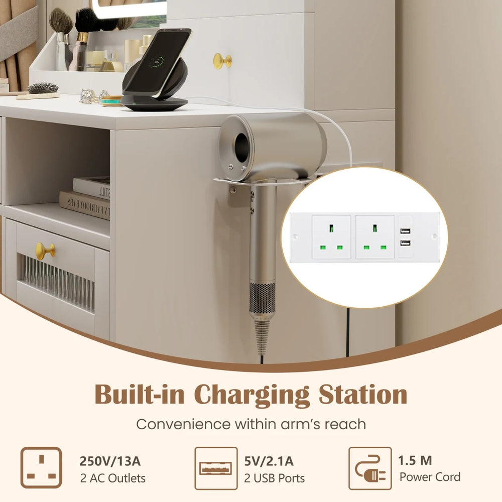 Colour: White + Golden Material: Engineered Wood + MDF + Silver Mirror + PU + Metal Overall Dimensions of Table: 96 x 40 x 135 cm (L x W x H) Overall Dimensions of Stool: 40 x 30 x 45 cm (L x W x H) Weight Capacity of Tabletop: 50 kg Weight Capacity of Stool: 150 kg AC Outlet: 250V/13A USB Port: 5V/2.1A Net Weight: 37 kg Package Includes: 1 x Vanity Table 1 x Stool 1 x Instruction Manual