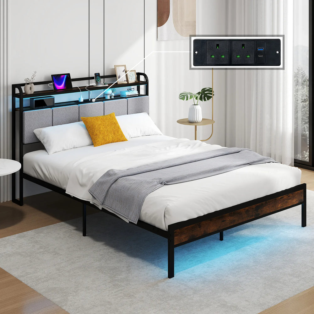 King Size Bed Frame with LED Light and Charging Station-King Size