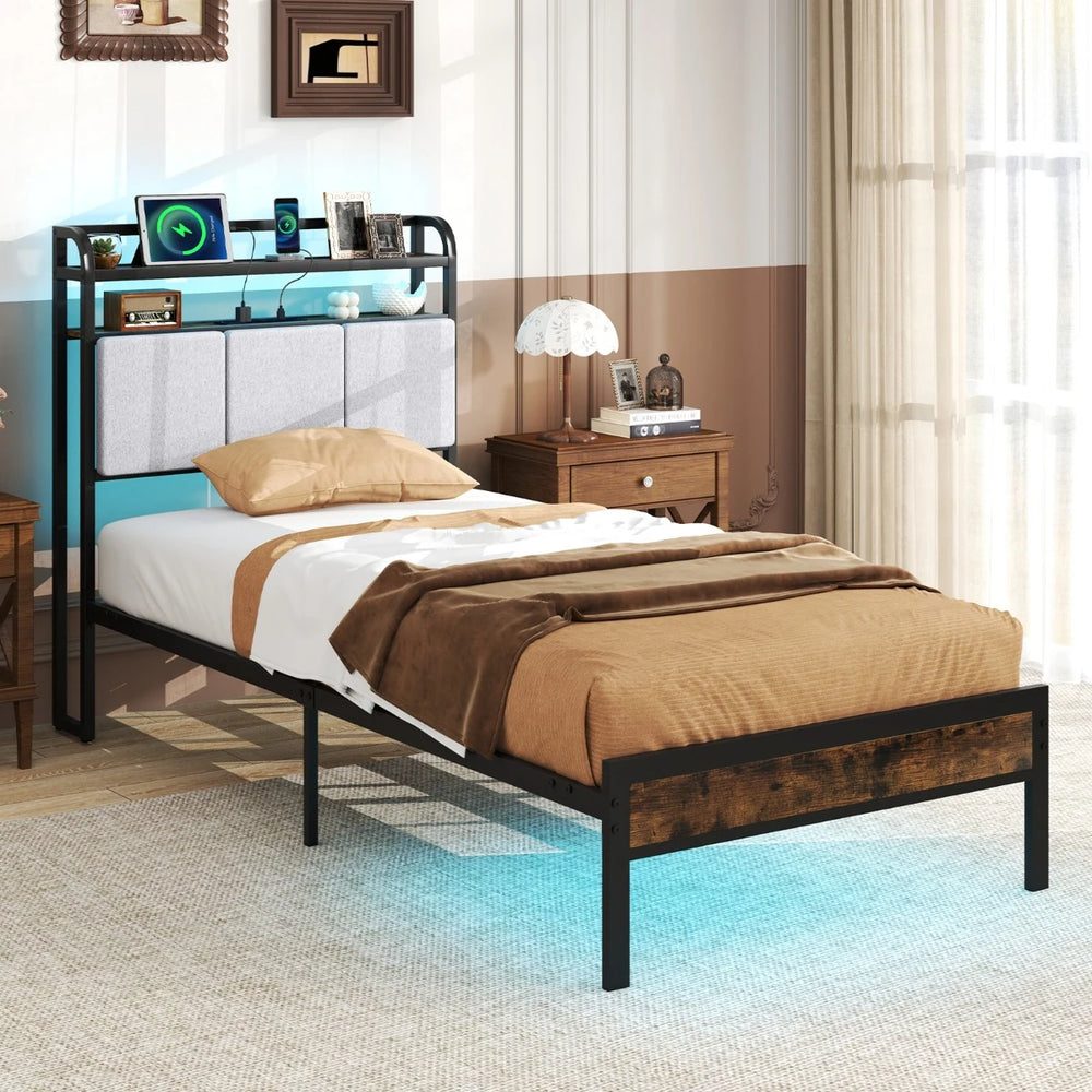 King Size Double Size Bed Frame with LED Light and Charging Station-Single Size