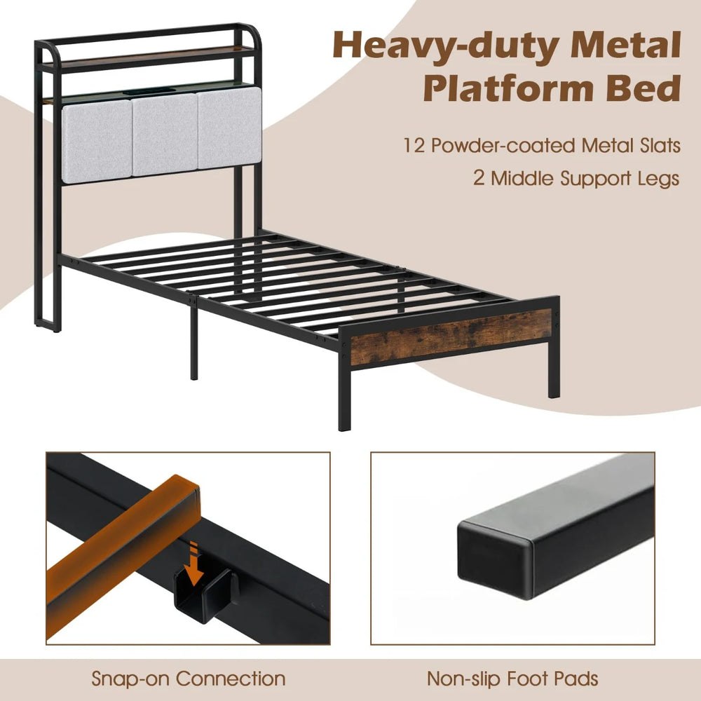 Colour: Rustic Brown + Black + Grey Material: Metal, Engineered Wood, Linen Fabric, Sponge King Size: Overall Dimensions: 222 x 153 x 110 cm (L x W x H) Headboard Width: 16 cm Height of Footboard: 36 cm Height of Under-bed Space: 26 cm 2 Outlets: 250V/13A USB Port & Type-C Port: 5V/3.1A Power Cord Length: 150 cm Effective Remote Control Distance: 5 m Weight Capacity: 500 kg Recommended Mattress Size: 200 x 150 x 20-30 cm (L x W x Thickness) Net Weight: 34 kg Double Size: Overall Dimensions: 208 x 137 x 110 cm (L x W x H) Weight Capacity: 500 kg Net Weight: 31 kg Recommended Mattress Size: 190 x 138 x 20-30 cm (L x W x Thickness) Single Size: Overall Dimensions: 199 x 93 x 110 cm (L x W x H) Weight Capacity: 240 kg Net Weight: 23 kg Recommended Mattress Size: 190 x 90 x 20-30 cm (L x W x Thickness) Box Qty:1(May vary by batch) Package Includes: 1 x Bed Frame 1 x Remote Control 1 x Instruction Manual