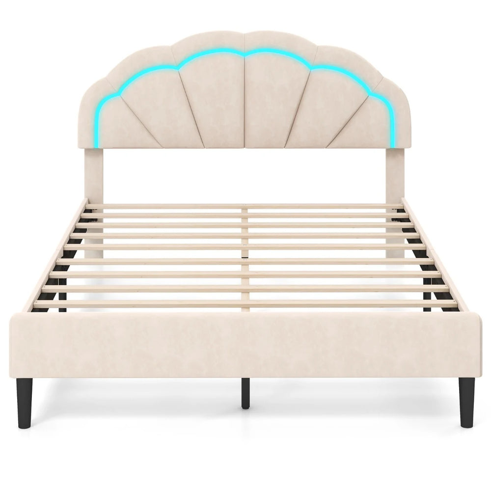 Upholstered LED Bed Frame with Adjustable Flower Headboard and Metal Support Feet-Queen Size
