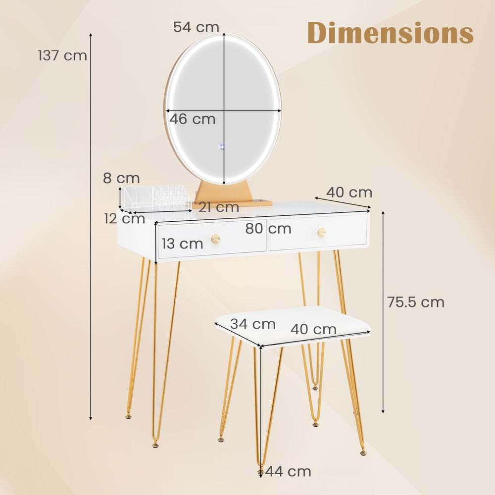 Colour: White + Gold Material: MDF, Metal, Glass Table Dimensions: 80 x 40 x 137 cm (L x W x H) Stool Dimensions: 40 x 34 x 44 cm (L x W x H) Mirror Dimensions: 46 x 54 cm (L x H) Drawer Inner Dimensions: 33 x 28 x 8 cm (L x W x H) Tabletop Weight Capacity: 50 kg Stool Weight Capacity: 150 kg Net Weight: 22 kg Box QTY: 1(May vary by batch) Package Includes: 1 x Vanity Table 1 x Stool 1 x Acrylic Makeup Organizer 1 x Power Adapter 1 x Instrcution Manual