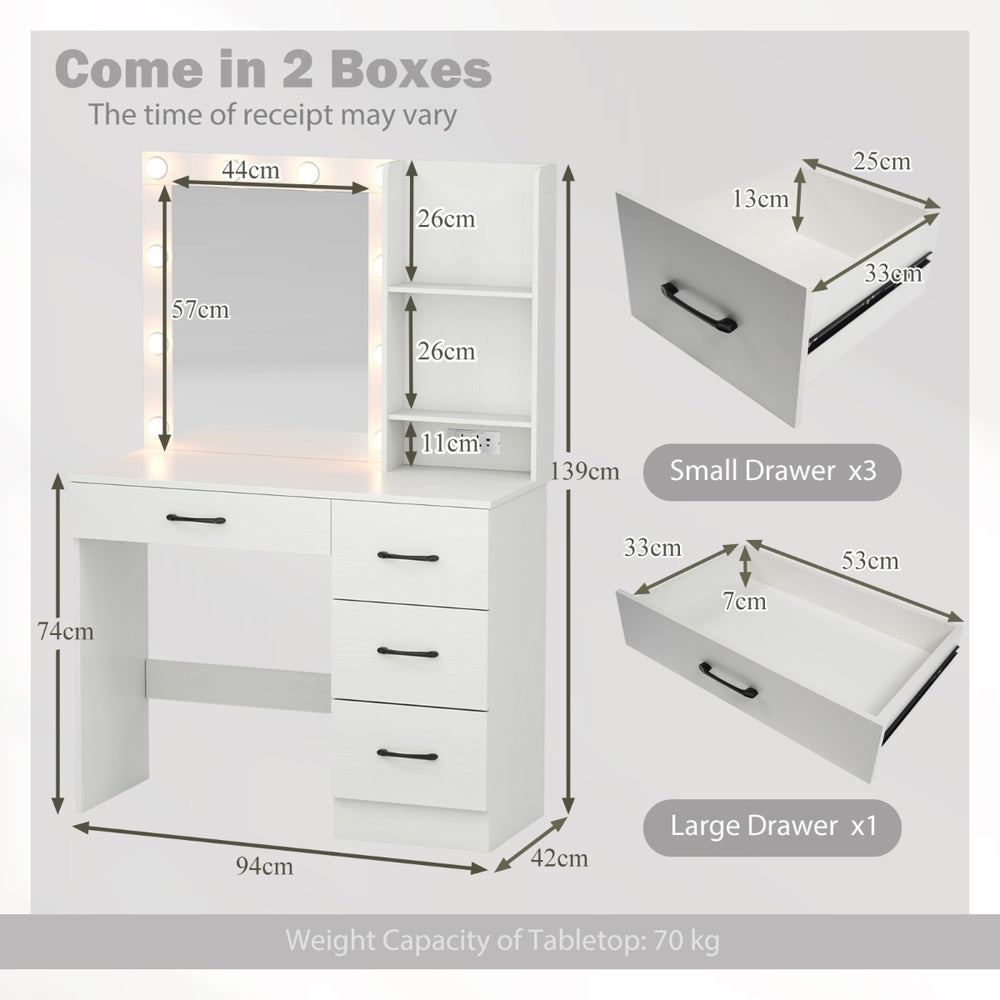 Colour: White Material: Engineered Wood + MDF + Glass Table Dimension: 94 x 42 x 139 cm (L x W x H) Large Drawer Dimensions: 53 x 33 x 7 cm (W x D x H) Small Drawer Dimensions: 25 x 33 cm x 13 cm (W x D x H) Mirror Dimensions: 57 x 44 cm (L x W) Weight Capacity of Tabletop: 70 kg Power Cord Length: 1.5 m Net Weight: 36 kg Box QTY: 1(May vary by batch) Package Includes: 1 x Vanity Table 1 x Instruction Manual