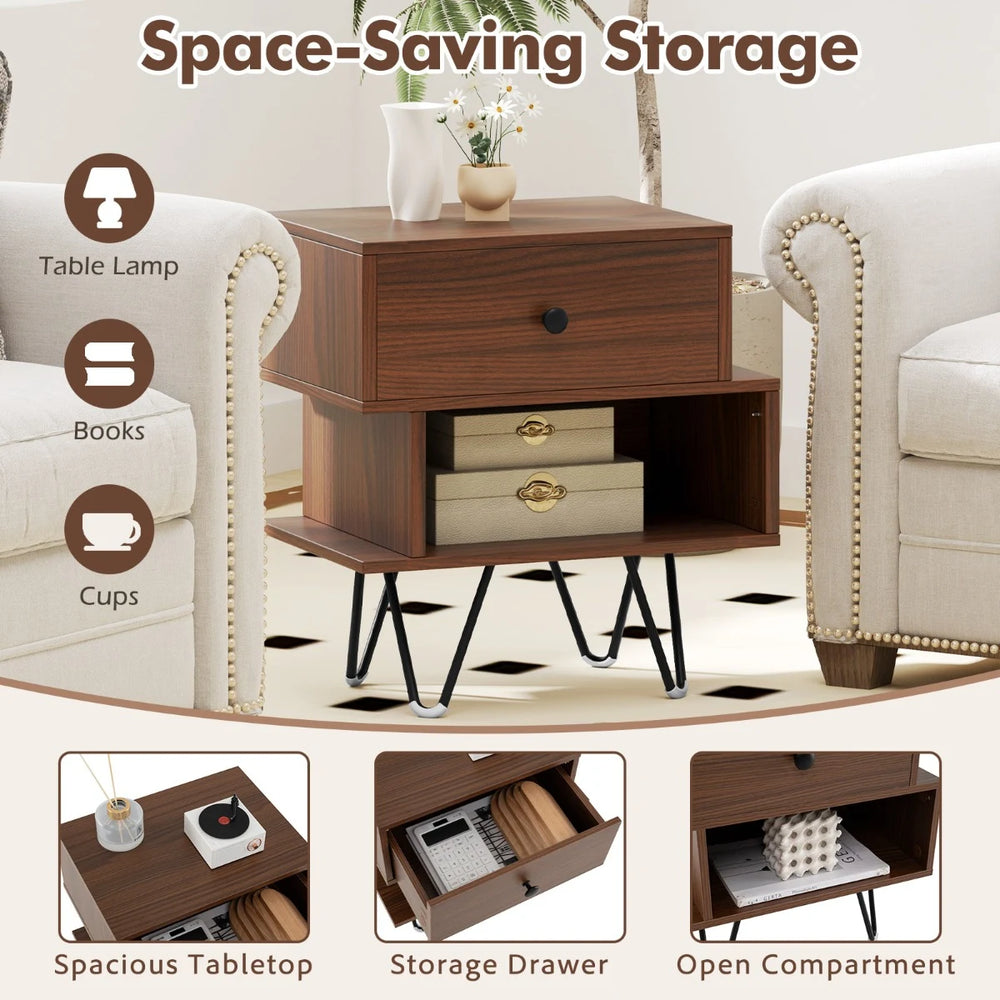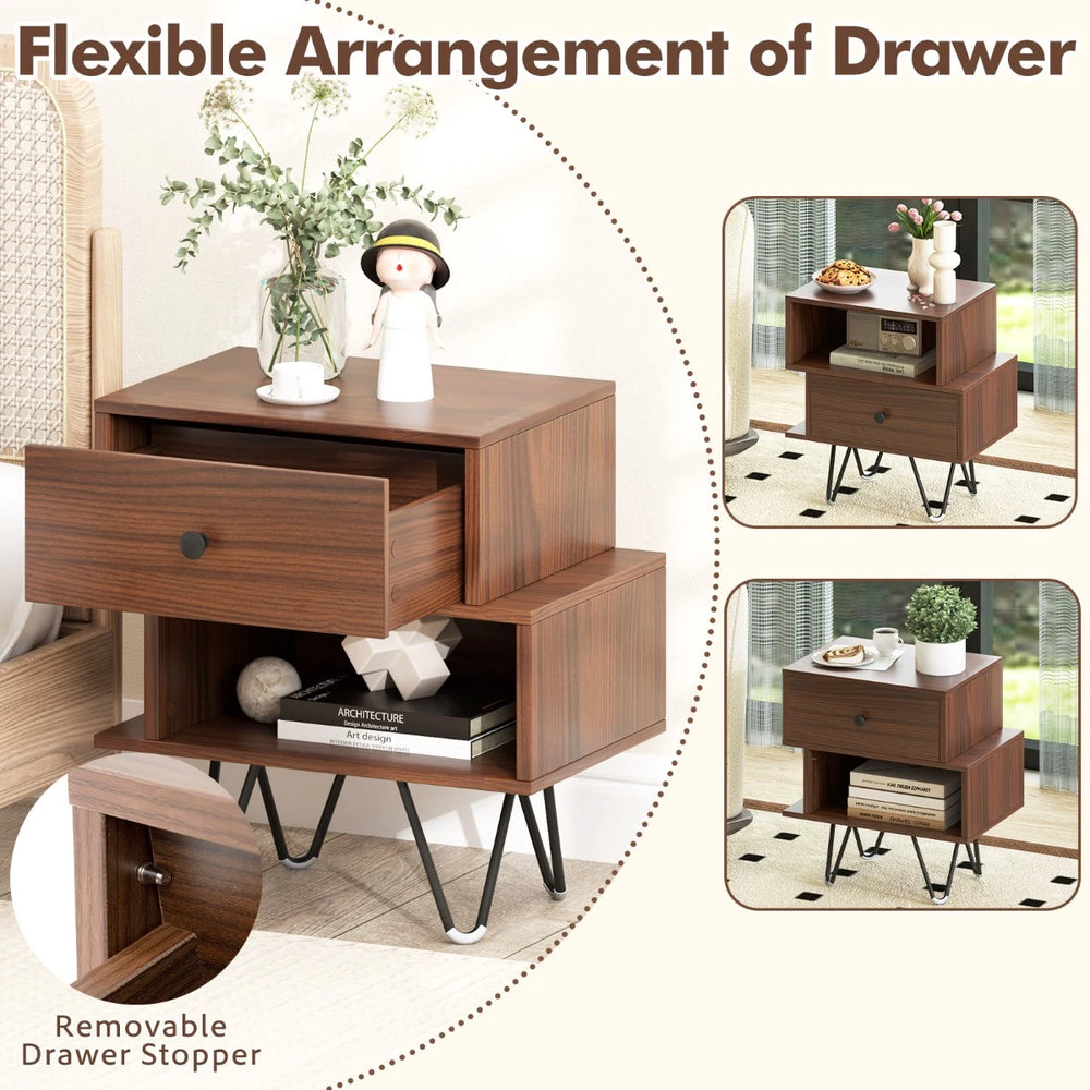 Mid Century Modern End Tables Set of 2 with Removable Drawer-Walnut