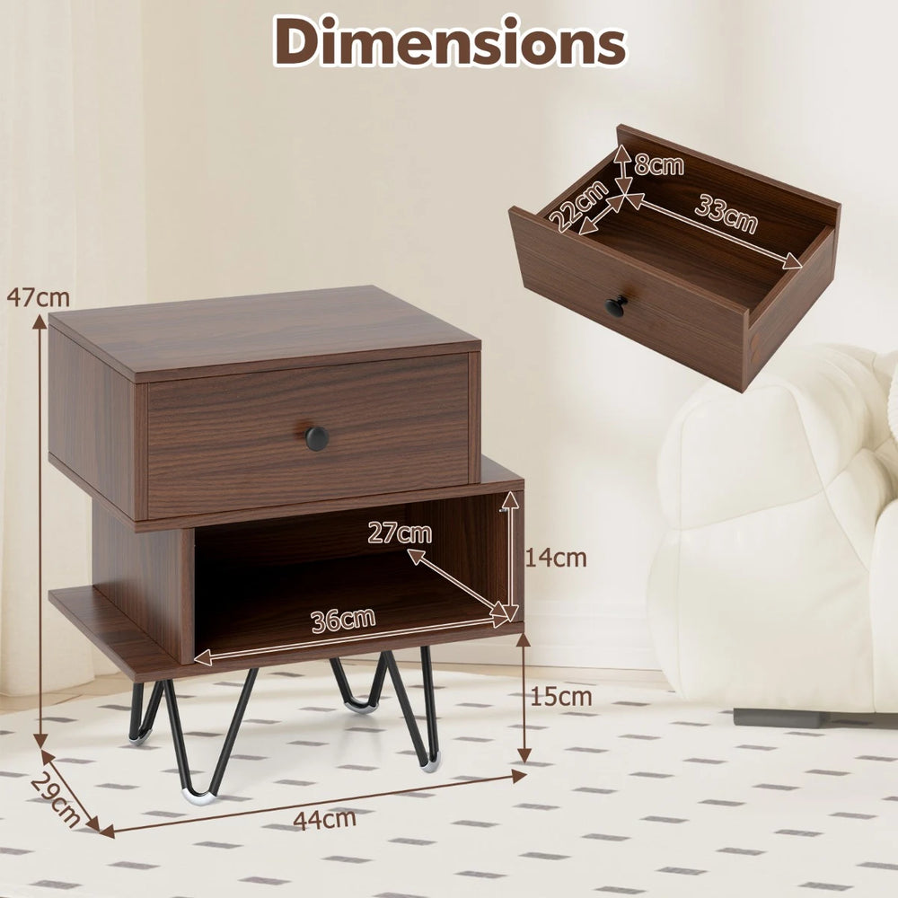Colour: Natural/Walnut Material: Engineered Wood, MDF, Metal Overall Dimensions: 44 x 29 x 47 cm (L x W x H) Open Compartment Dimensions: 36 x 27 x 14 cm (W x D x H) Inside Dimensions of Drawer: 33 x 22 x 8 cm (W x D x H) Weight Capacity of Tabletop: 25 kg Weight Capacity of Compartment / Drawer: 5 kg Net Weight: 15 kg Box QTY: 1 Package Includes: 2 x Nightstand 1 x User Manual