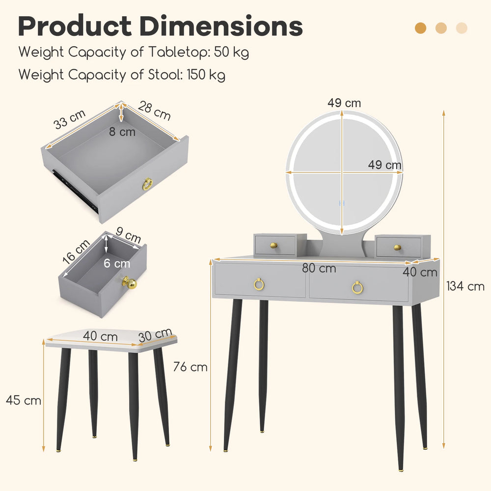 Color: Grey Material: MDF + Glass + Metal Table Dimension: 80 x 40 x 134 cm (L x W x H) Stool Dimension: 40 x 30 x 45 cm (L x W x H) Mirror Diameter: 49 cm Tabletop Height: 76 cm Inner Size of Large Drawer: 33 x 28 x 8 cm (W x D x H) Inner Size of Small Drawer: 16 x 9 x 6 cm (W x D x H) Weight Capacity of Tabletop: 50 kg Weight Capacity of Stool: 150 kg Weight Capacity of Each Drawer: 5 kg Power Cord Length: 1.5 m Net Weight: 22.5 kg Box Qty: 1 Package Includes: 1 x Vanity Table 1 x Stool 1 x User Guide