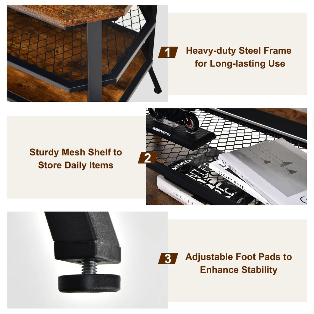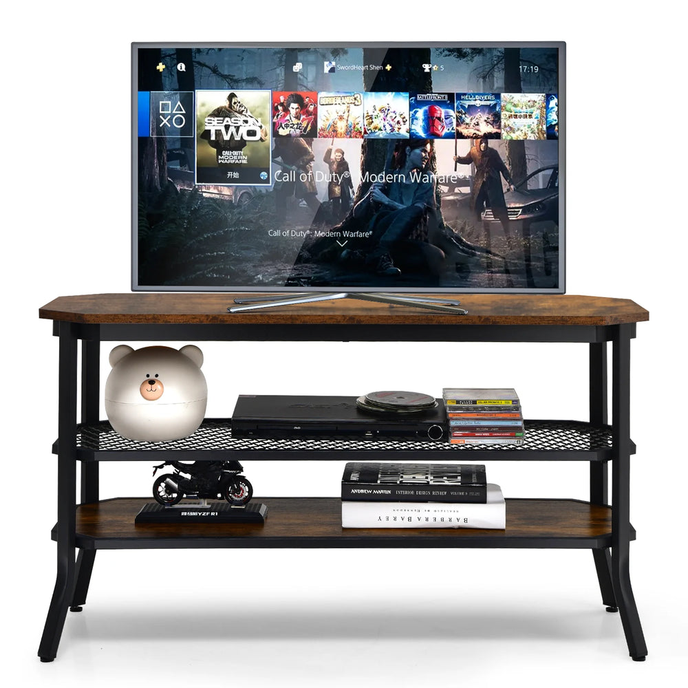Are you searching for a great TV stand to enhance your space in charming? Our industrial rustic TV cabinet will be appealing aesthetic furniture for your home. With a spacious desktop, the multifunctional TV stand creates additional storage space for a 46" TV and ornaments. 2-tier open shelves keep a variety of items well organized and ensure easy access. Crafted from premium engineered wood and steel, the entertainment center gives your items strong support for prolonged life. Whats more, 17.5cm high bottom brings a lot of convenience for robot cleaning. This eye-catching TV stand with chic design highlights your living room, bedroom and more. Bullet Point: Spacious Desktop & Large Storage Space: Measuring 100 x 40cm, the desktop is wide enough to accommodate TVs up to 116cm. The middle shelf and bottom shelf allow you to store DVD player, book, remote control, ornament and other necessities. Durable Construction with Remarkable Stability: The TV stand is made of high-quality engineered wood and steel, which features increased stability and long-lasting durability. Additionally, the heavy-duty steel frame with high load-bearing capacity gives items a strong and stable support. Thoughtful & Humanized Details: The reasonable bottom height of 17.5cm is perfect for cleaning robot, thus bringing a lot of convenience to daily maintenance. Moreover, there are 4 adjustable foot pads to add extra stability and avoid scratching on the floor. Industrial Rustic Style for Multiple Scenes: Combine industrial rustic look and functional utility, this attractive TV stand creates an elegant and warm ambiance in your space. It will seamlessly match the surroundings of your room, furniture, and style. you can put it in the living room and bedroom as a television table or side table. Quick Assembly & Low Maintenance: The package includes detailed instructions and complete accessories, so you can put the TV stand together easily. A smooth and waterproof surface allows you to wipe off dust and stains with a damp cloth. Features: A large desktop fits TVs up to 116 cm and provides display space for decorations 2-tier open shelves for storing DVD player, book, remote control, and decorations Superior engineered wood adds stability for long-lasting service life Adjustable foot pads prevent the floor from being scratched The industrial rustic look brings elegance and beauty to your living room and bedroom Can be used as a TV table, coffee table, entryway table, side table, and more A smooth and waterproof surface brings a lot of convenience to clean. Specifications: Color: Rustic Brown Material: Engineered Wood + Steel Overall size: 100cm L x 40cm W x 55.5cm H Net weight: 12.5kg Max. the load capacity of tabletop: 50kg Max. the load capacity of shelf: 20kg Package Includes: 1 x TV Stand 1 x Instruction