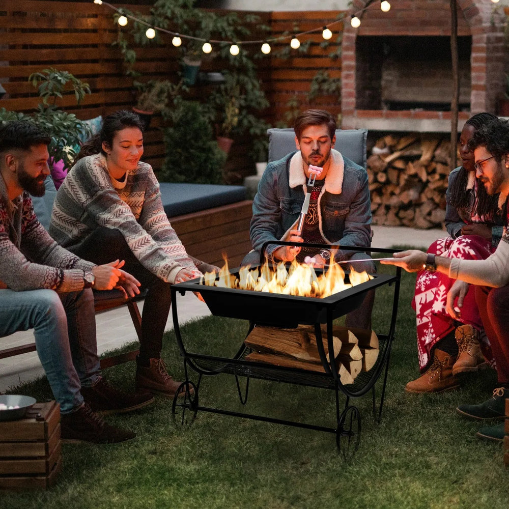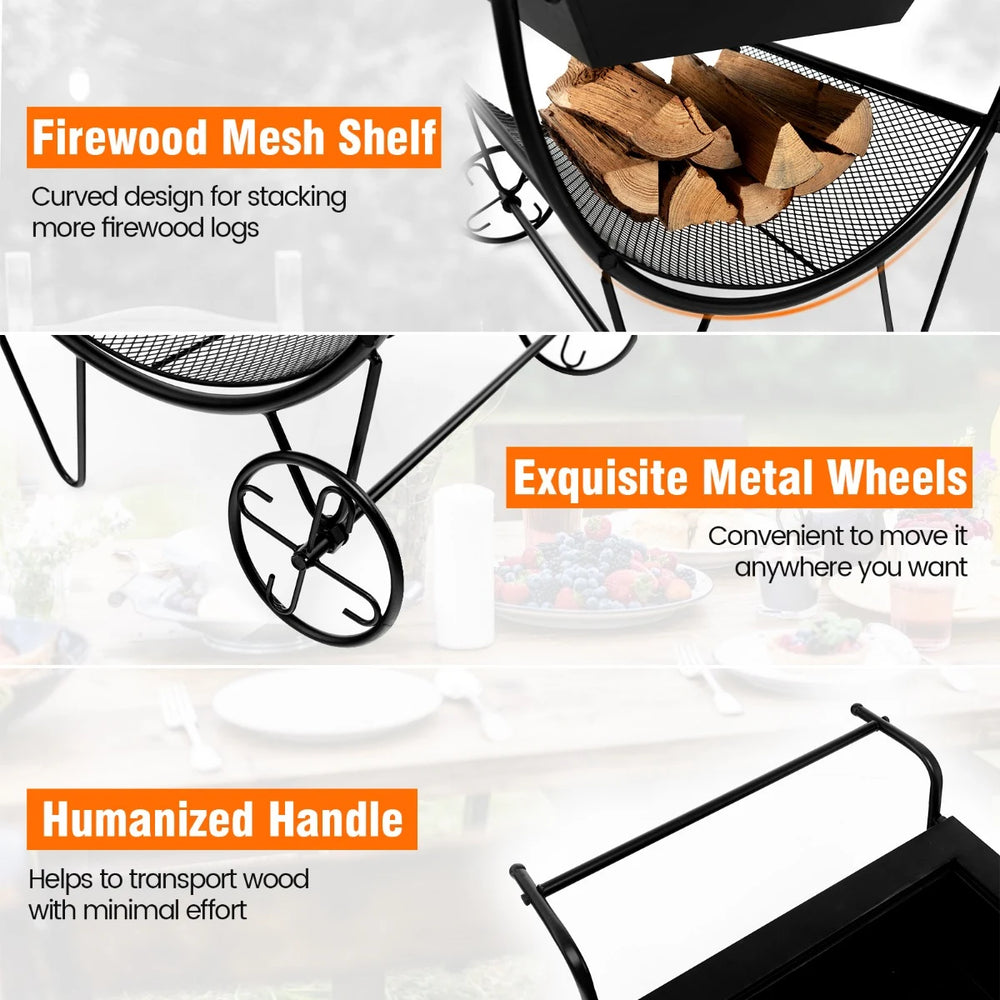 Outdoor Wood Burning Fire Pit with Log Storage Rack and Wheels