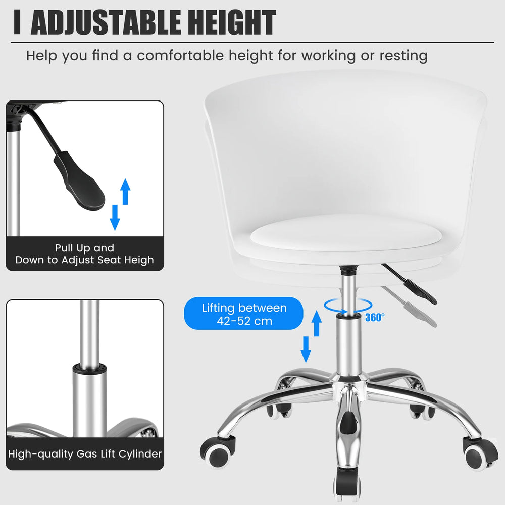 Specification Color White/Black Material PP, PU, sponge, metal Overall dimensions 22.5" x 21" x 27.5"-31.5" Seat dimensions 18" x 16.5" (W x Depth) Adjustable seat height 16.5"-20.5" Base diameter 21" Weight limit 330 lbs Net weight 26 lbs