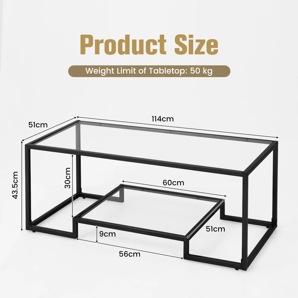 Color: Black Material: Tempered glass, steel Overall dimension: 42" x 20" x 17"(L x W x H) Size of bottom shelf: 24" x 20"(L x W) Net weight: 33.5 lbs Weight capacity of tabletop: 200 lbs Weight capacity of shelf: 44 lbs Package includes: 1 x Tempered glass coffee table 1 x User guide