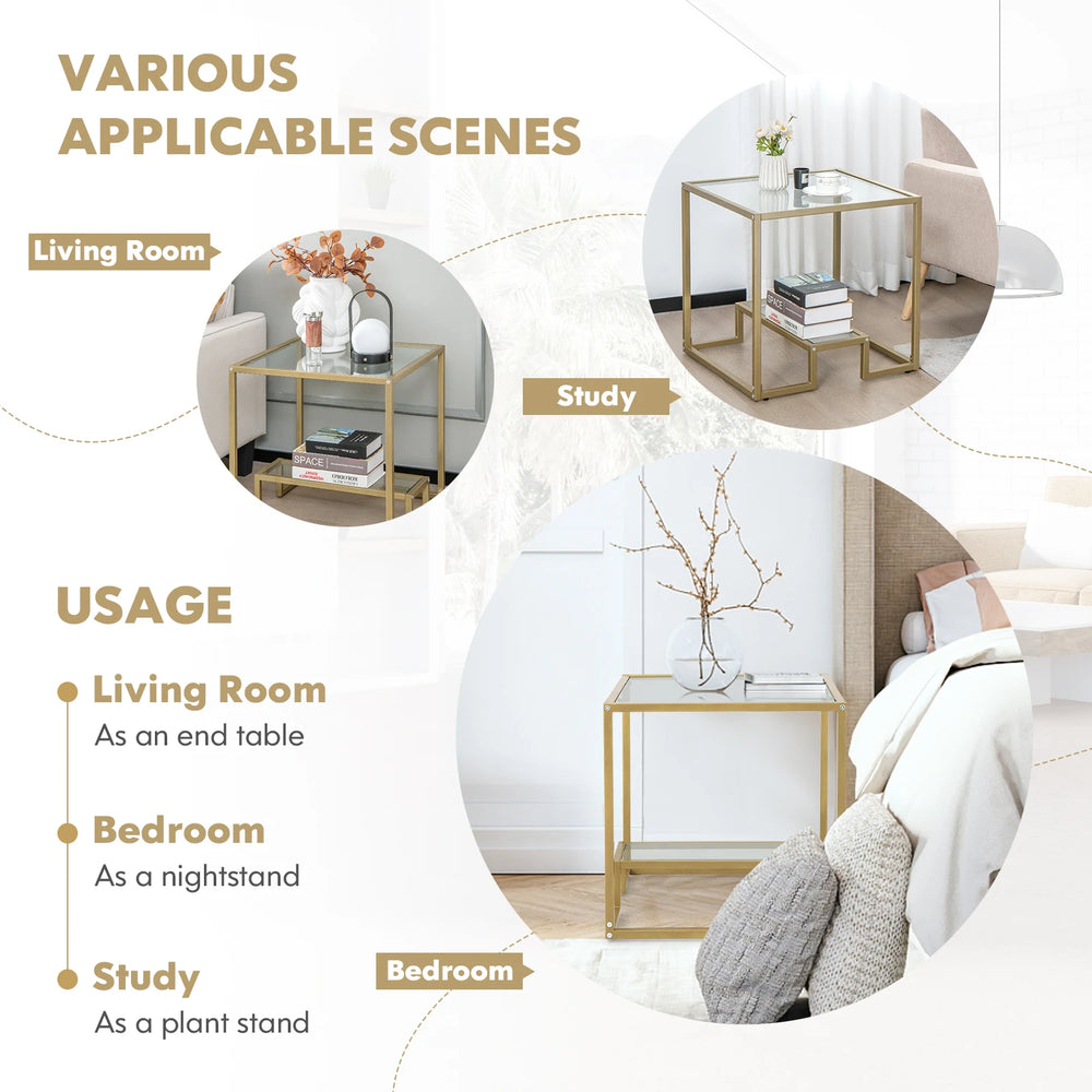 22 Inch 2-Tier Square Sofa Side Table with Tempered Glass Tabletop-Golden
