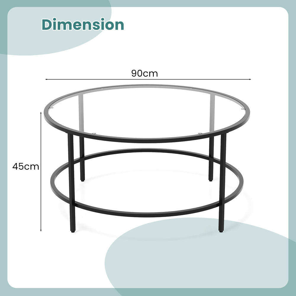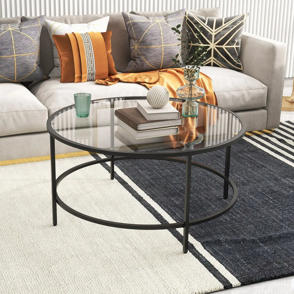35.5 Inch Round Coffee Table with Tempered Glass Tabletop-Black