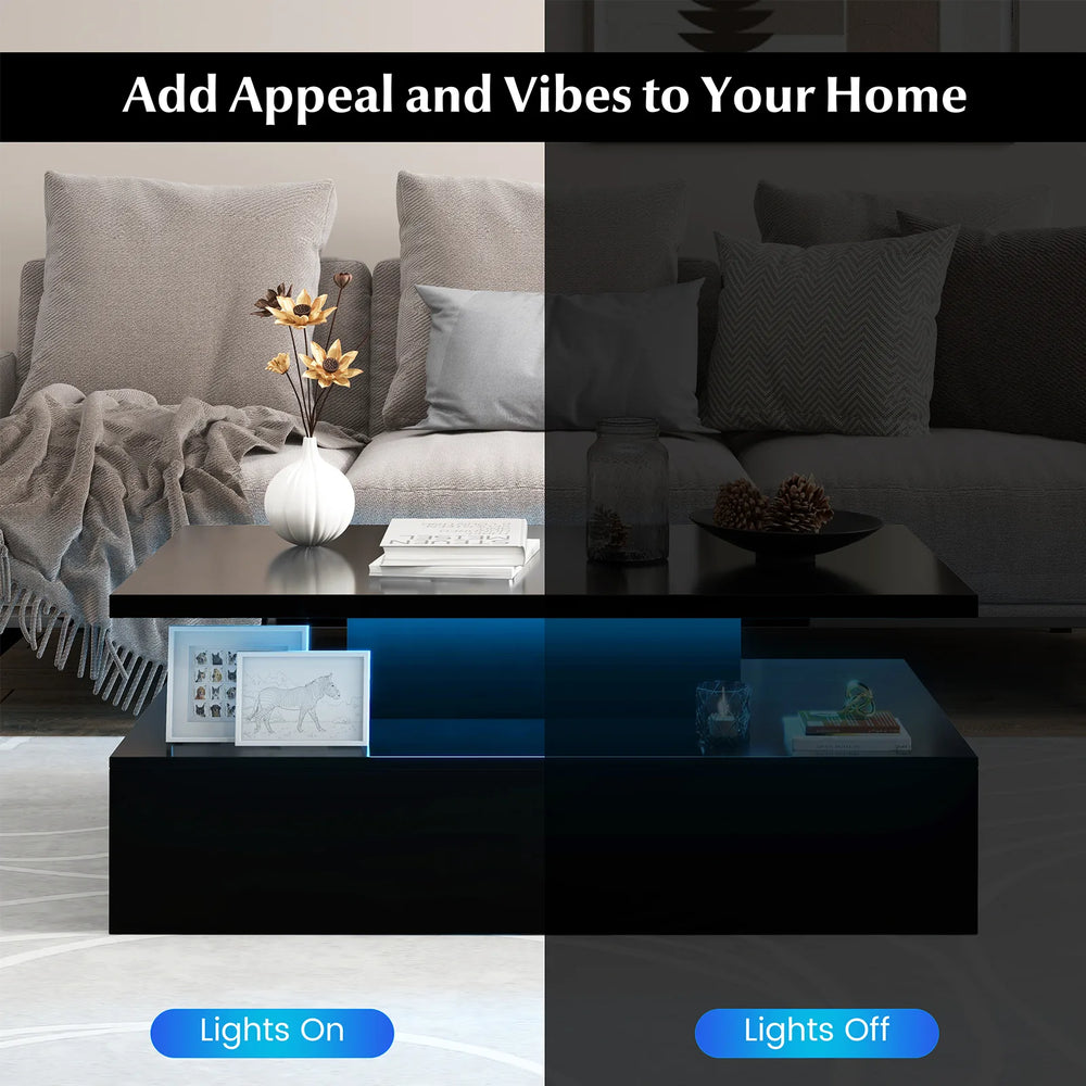 Modern 2-tier High Glossy Black Coffee Table with Adjustable Light Colors-Black