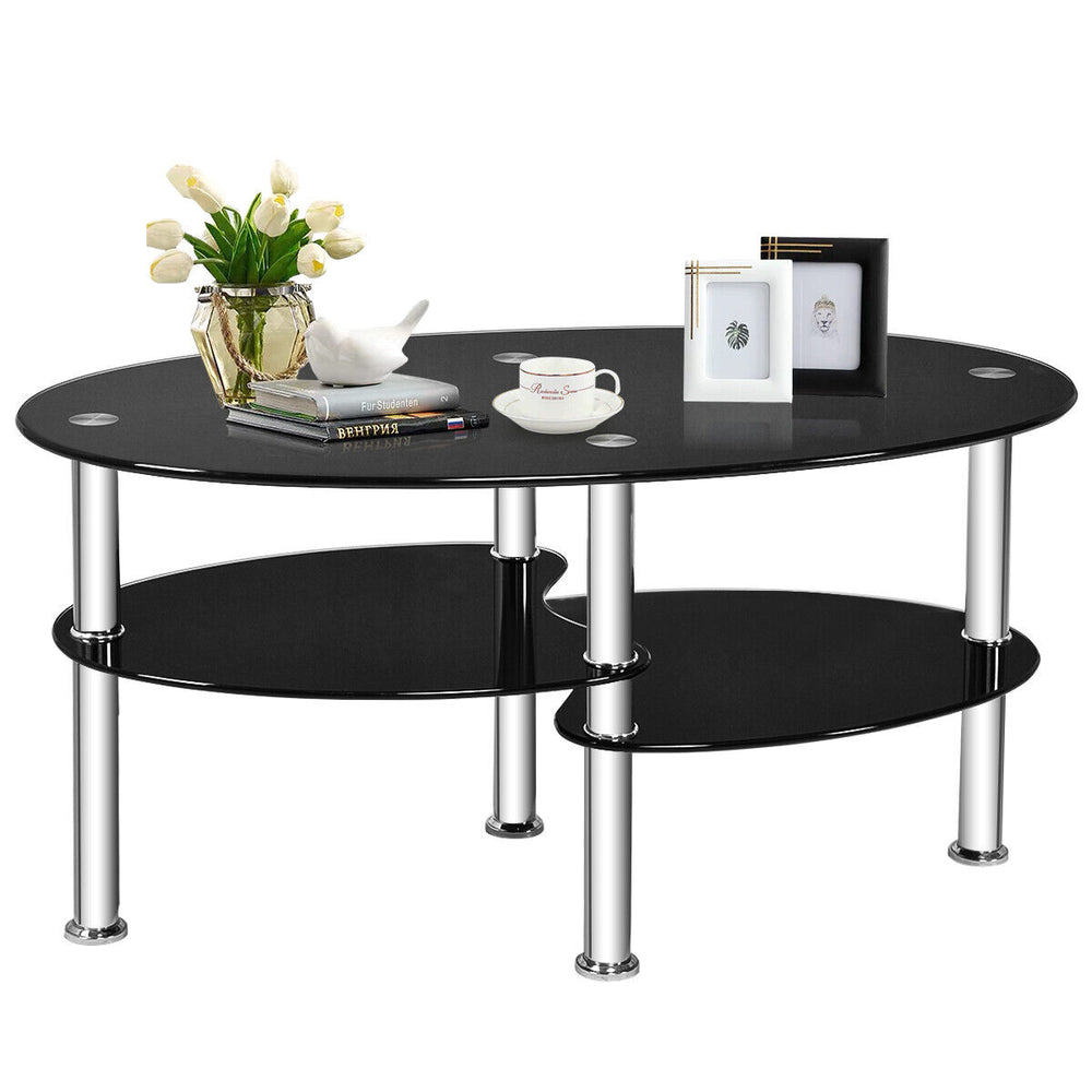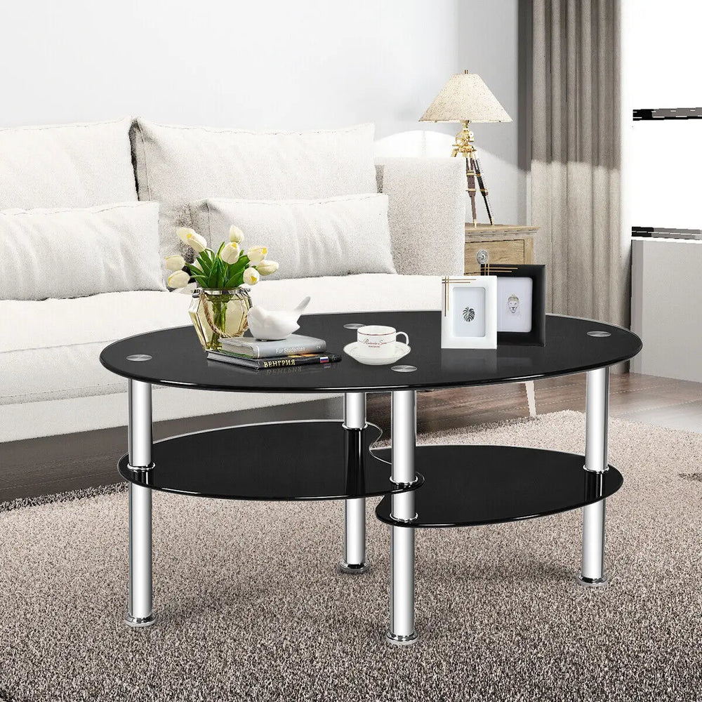 This 3-tier coffee table pairs tempered glass surfaces with a black steel frame to create a modern centrepiece for living rooms or reception areas. The oval tabletop and two curved lower shelves present a minimalist silhouette that complements contemporary interiors while keeping essentials on display.