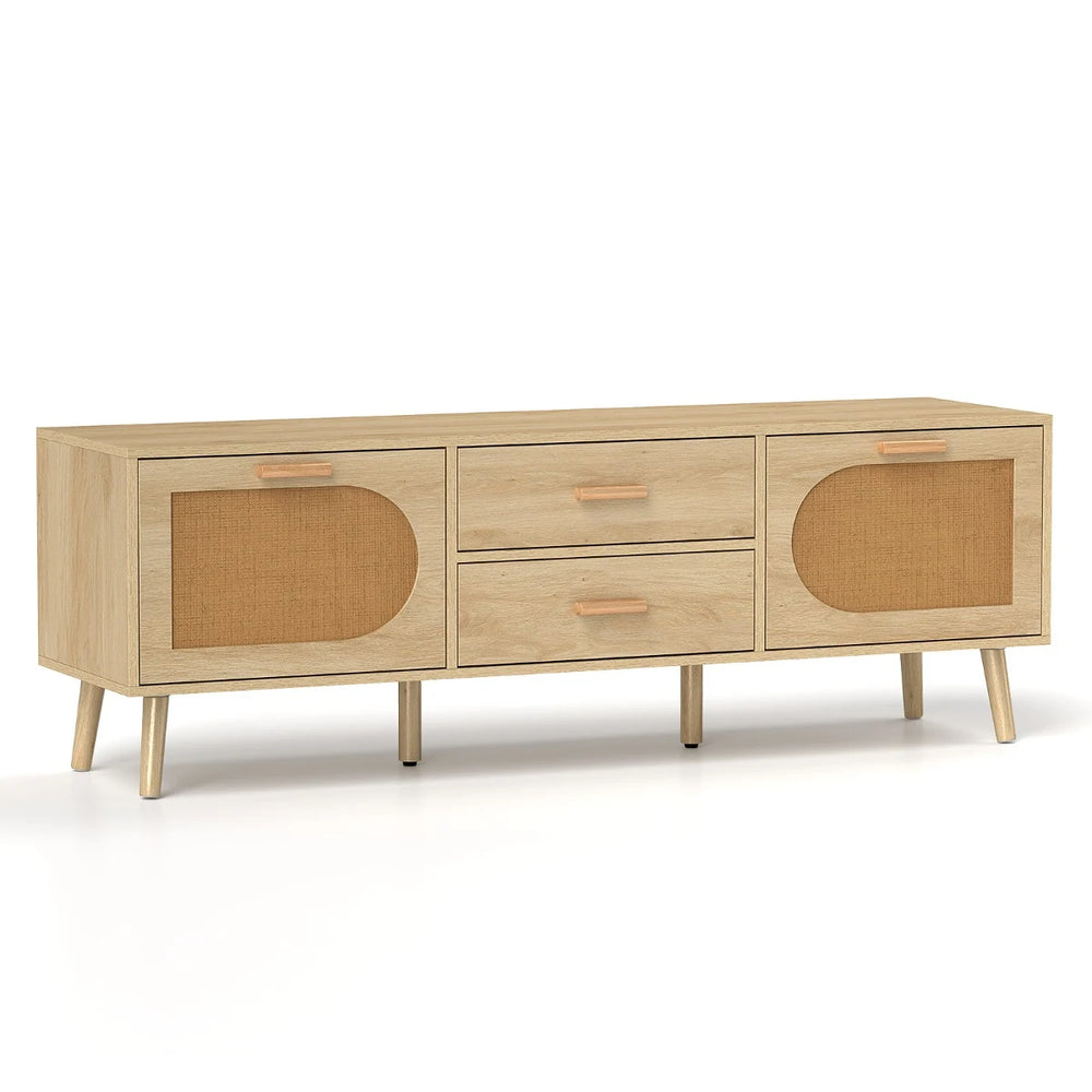 Rattan TV Stand for 65-Inch TV with Drawers and Solid Wood Legs-Natural