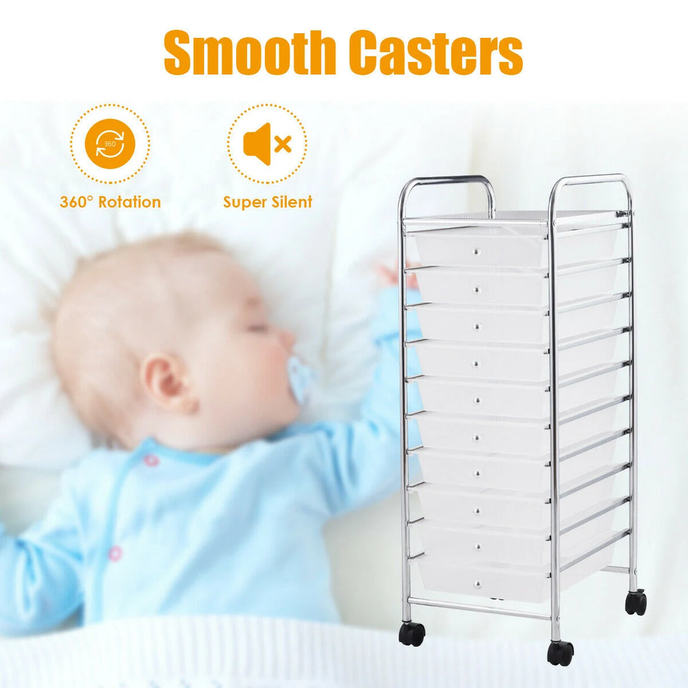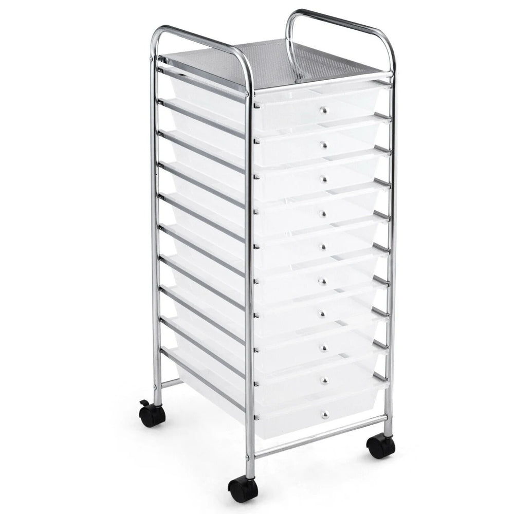 This compact rolling storage cart brings order to busy workspaces with ten removable clear PP drawers and a chrome-plated steel frame. Its tall, slim footprint helps save floor space while keeping small tools, stationery and craft supplies neatly organised and easily accessible.