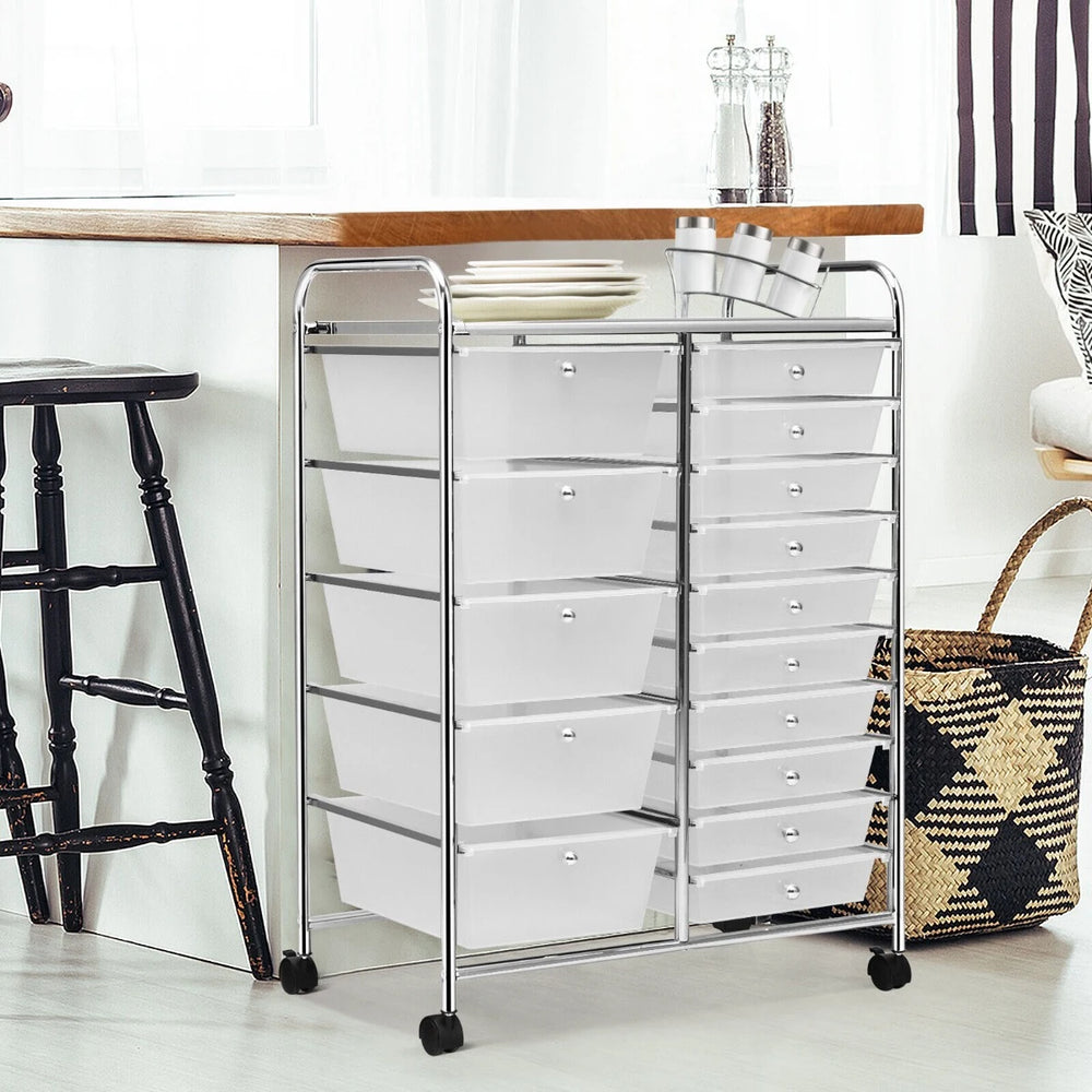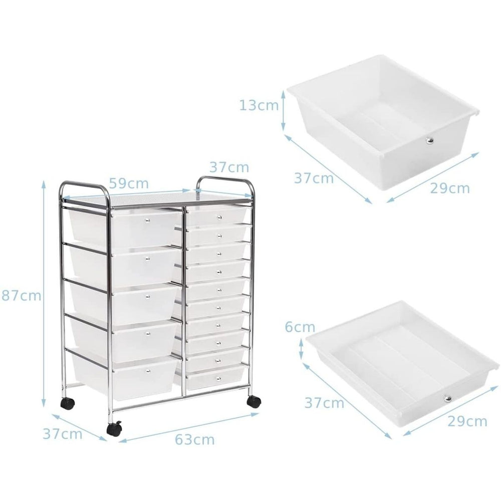 Do you want to have a storage cart which can be rolled smoothly from one place to another? Our 15-drawer rolling storage cart will provide enough storage space for you. It is great for paper, tools, accessories, crafting, scrapbooking or home office, helping you to organize and make your tools in order. Constructed of industrial-strength metal tubes and finished in chrome, the drawer cart is sturdy to serve you for a long time. Equipped with easy-to-grab handles and 4 universal wheels, it is easy to move the lightweight cart. And 2 of the wheels have a simple lock for easy stopping. With our utility storage organizer, you can store various things from art and office supplies to cleaning or kitchen essentials. It is ideal to arrange your different stuff at the office, home, school and garage or just about anywhere organization is needed. Bullet Point: Sufficient storage space with 15 drawers: The rolling storage cart includes 5 big drawers and 10 small drawers which provide ample space for you to store stuff in different categories. Equipped with two small round handles, the drawer is convenient to pull out or push in. Versatile Function: It is an ideal choice for you to make your work places or home more organized and neater because this storage drawer cart can perfectly place its practical role in a variety of occasions such as office, home, living room, entryway, bathroom, school, garage etc. Durable Metal Frame and Light Weight: The main frame of this drawer storage cart is made of premium steel and processed with smooth chrome finish. This 15-drawer rolling storage trolley will serve you for a long time and not easy to be deformed. Flexibility & Mobility: Four universal wheels can swivel 360 degrees and help you move it easily. This drawer shelf cart is easily assembled and all-required accessories and a detailed manual comes with the cart. Lockable brake design ensures its stability if you want it to stay still at some specific place. Beautiful Decoration: In addition to its practical storage use, these colorful boxes also work as a beautiful decoration item in your living space, home, office or school. Different colors offer you great convenience to classify your stuff. Features: 15 removable drawers for storage and classification Metal frame and plastic drawers, durable and can be used for a long time 4 universal wheels (2 with lock) for easy movement and fixation Drawers slide through metal channels with no resistance Drawer with a knob for easy closing and opening Easy to pull or push the cart with 2 handles on the top Spacious storage space on the top of the cart Ideal drawer storage cart for home, office, garage and school Drawers are easy to clean with soap and damp cloth Easy to assemble in short time according to instruction Specifications: Color of Frame: White/Silvery Color of Drawer: Clear Material: Steel and Plastic Overall size: 63 x 37 x 87cm (L x W x H) Inner Size of Big Drawer: 34.3 x 22.9 x 11.4cm (L x W x D) Inner Size of Small Drawer: 34.3 x 22.9 x 5.1cm (L x W x D) Diameter of Wheel: 3.8cm Weight of Cart: 7.6kg Weight Capacity: 18kg Package Includes: 1 x 15-drawer Rolling Cart 1 x Instruction