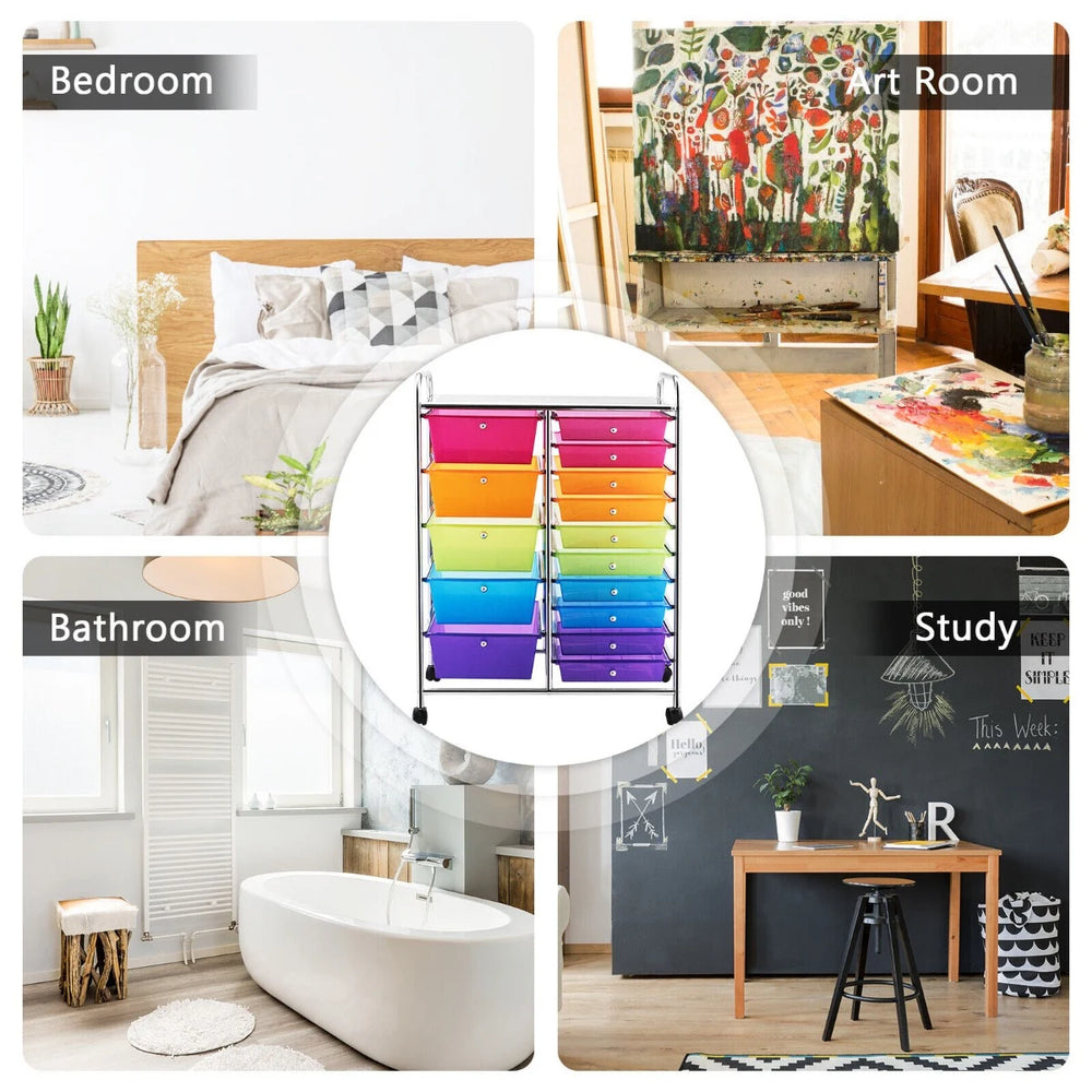 Do you want to have a storage cart which can be rolled smoothly from one place to another? Our 15-drawer rolling storage cart will provide enough storage space for you. It is great for paper, tools, accessories, crafting, scrapbooking or home office, helping you to organize and make your tools in order. Constructed of industrial-strength metal tubes and finished in chrome, the drawer cart is sturdy to serve you for a long time. Equipped with easy-to-grab handles and 4 universal wheels, it is easy to move the lightweight cart. And 2 of the wheels have a simple lock for easy stopping. With our utility storage organizer, you can store various things from art and office supplies to cleaning or kitchen essentials. It is ideal to arrange your different stuff at the office, home, school and garage or just about anywhere organization is needed. Bullet Point: Sufficient storage space with 15 drawers: The rolling storage cart includes 5 big drawers and 10 small drawers which provide ample space for you to store stuff in different categories. Equipped with two small round handles, the drawer is convenient to pull out or push in. Versatile Function: It is an ideal choice for you to make your work places or home more organized and neater because this storage drawer cart can perfectly place its practical role in a variety of occasions such as office, home, living room, entryway, bathroom, school, garage etc. Durable Metal Frame and Light Weight: The main frame of this drawer storage cart is made of premium steel and processed with smooth chrome finish. This 15-drawer rolling storage trolley will serve you for a long time and not easy to be deformed. Flexibility & Mobility: Four universal wheels can swivel 360 degrees and help you move it easily. This drawer shelf cart is easily assembled and all-required accessories and a detailed manual comes with the cart. Lockable brake design ensures its stability if you want it to stay still at some specific place. Beautiful Decoration: In addition to its practical storage use, these colorful boxes also work as a beautiful decoration item in your living space, home, office or school. Different colors offer you great convenience to classify your stuff. Features: 15 removable drawers for storage and classification Metal frame and plastic drawers, durable and can be used for a long time 4 universal wheels (2 with lock) for easy movement and fixation Drawers slide through metal channels with no resistance Drawer with a knob for easy closing and opening Easy to pull or push the cart with 2 handles on the top Spacious storage space on the top of the cart Ideal drawer storage cart for home, office, garage and school Drawers are easy to clean with soap and damp cloth Easy to assemble in short time according to instruction Specifications: Color of Frame: White/Silvery Color of Drawer: Multi-color Material: Steel and Plastic Overall size: 63 x 37 x 87cm (L x W x H) Inner Size of Big Drawer: 34.3 x 22.9 x 11.4cm (L x W x D) Inner Size of Small Drawer: 34.3 x 22.9 x 5.1cm (L x W x D) Diameter of Wheel: 3.8cm Weight of Cart: 7.6kg Weight Capacity: 18kg Package Includes: 1 x 15-drawer Rolling Cart 1 x Instruction