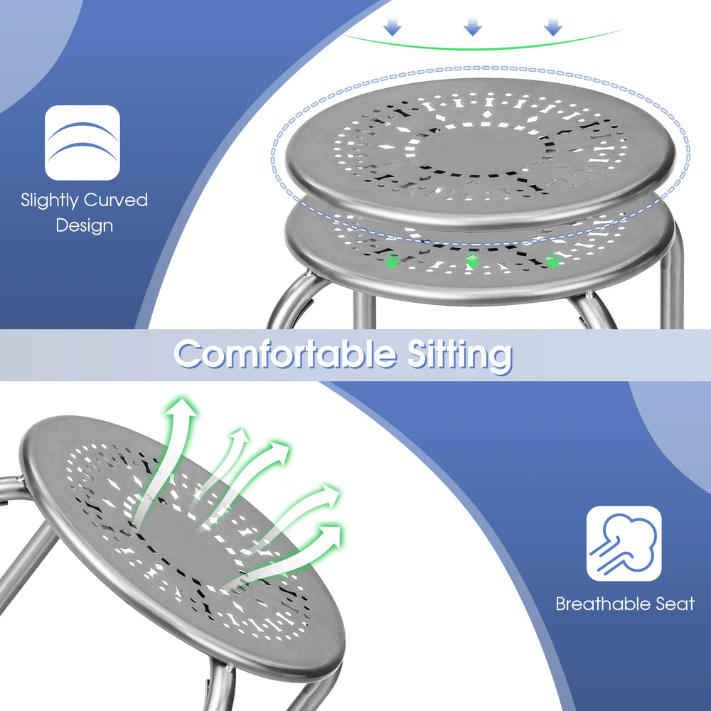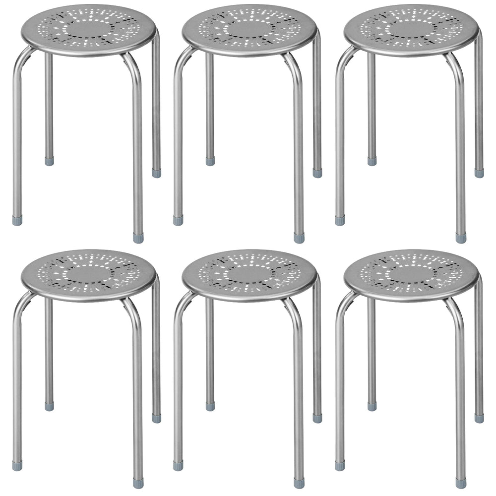 This pack of six round metal stools blends decorative style with everyday practicality. Each stool features a daisy pattern cut-out on the seat and a durable powder‑coated finish that helps resist rust and wear, making them suitable for both indoor and outdoor spaces.