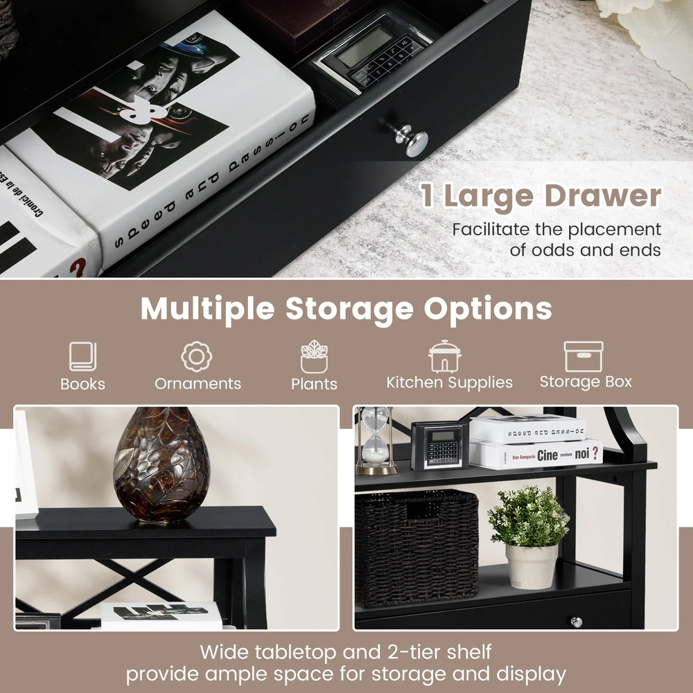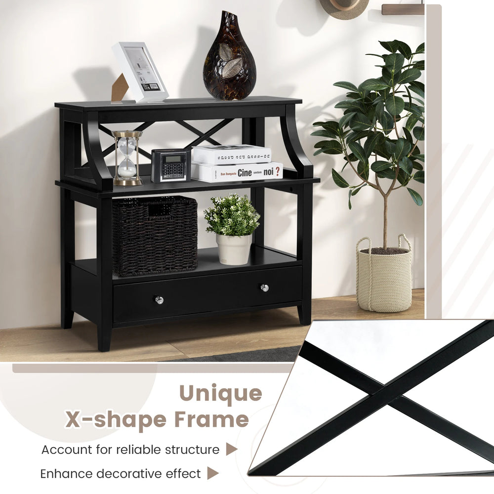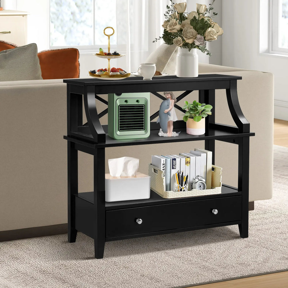 Are you finding a storage rack to help you to store things in your home? This storage rack is a good choice for you. It is ideal for you to keep your room tidy and clean in a small space occupation. In the bathroom, it can sit between the shower and sink to provide enough space to display or store bathroom essentials. In the kitchen, the storage rack can be put against the wall to store sauces and dishes. And you also can put it in your study room, living room or bedroom to be a display rack for some books, photo frames, plants and so on. Made of durable and sturdy MDF, the rack will provide long-time service for you. Its stylish design makes this storage rack match well with any other home furniture or decor easily. The paint finish is water-resistant and the whole product can be cleaned by wiping it over with clothes. Don't hesitate to buy it. Bullet Point: Large Storage Space: With a 2-tier shelf and a large drawer, our console table provides you with ample storage space to store your daily items, such as vases, books, plants, kitchen supplies, towels, etc. Our console table can help you to freely sort out different items and keep your room tidy. Versatile & Practical Table: The multi-purpose table can fully satisfy your different storage needs. You can use it as a sofa table in the living room or a console table at your entrance. Apart from that, it can also be used as an end table, a side table or a lamp table in various places. Durable & Stable Structure: Solid MDF frame and thickened panels keep it stable and sturdy. Its not easy to wobble. Each shelf and drawer can hold up to 15 kg, allowing you to place a lot of things. In addition, the X-shaped support on the back prevents things from falling and ensures more stability. High-Quality Material: Constructed of premium MDF material, our sofa bed is strong, sturdy and durable to use. Our table is not easy to deform during the use process. Besides, the painted surface is smooth, non-yellowing and solid, which can offer you a long-lasting service life. User-Friendly Design: 2 sliver knobs allow you to easily open or close the drawer, which brings much convenience. Moreover, it comes with illustrated instructions and all required accessories for simple installation. A smooth surface makes it easy to clean. You can wipe it with a soft cloth. Features: X-shape back design to prevent things from falling down Waterproof surface with excellent paint finish Spacious storage space with shelves and a drawer Made of high-quality MDF board to secure sturdiness Concise and fashionable design to fit any style of decoration Multifunctional storage racks can be put in many places Easy to install by yourself with instructions Specifications: Colour: Black/White Material: MDF Overall dimension:78 x 35 x 75 cm (L x W x H) Inner dimension of the drawer: 68.5 x 29.5 x 12 cm (L x W x H) Net weight: 19 kg Weight capacity of each shelf: 15 kg Weight capacity of drawer: 15 kg Package Include: 1 x Console Table 1 x Instruction