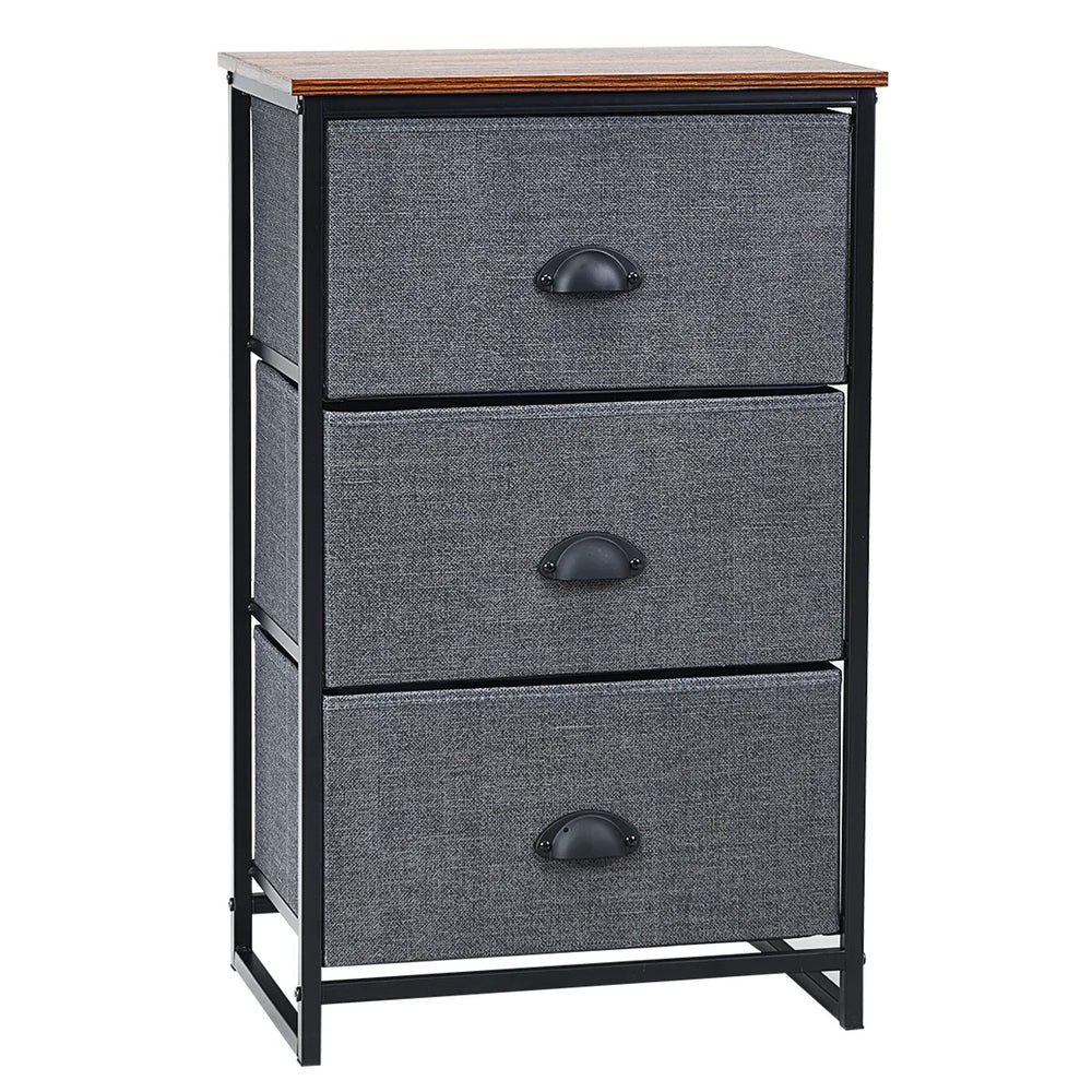 Material: Steel ,MDF, Non-woven Fabric Net weight:11lbs Product dimensions: 18" x 12" x 29" (L x W x H) The top measures: 18" x 12" (L x W) Drawer dimensions: 16" x 10.5" x 8" (L x W x H) Weight capacity of drawer:5.5 lbs Weight capacity of table top:66 lbs Package includes: 1 x 3-layer chest of drawers 1 x Instructions