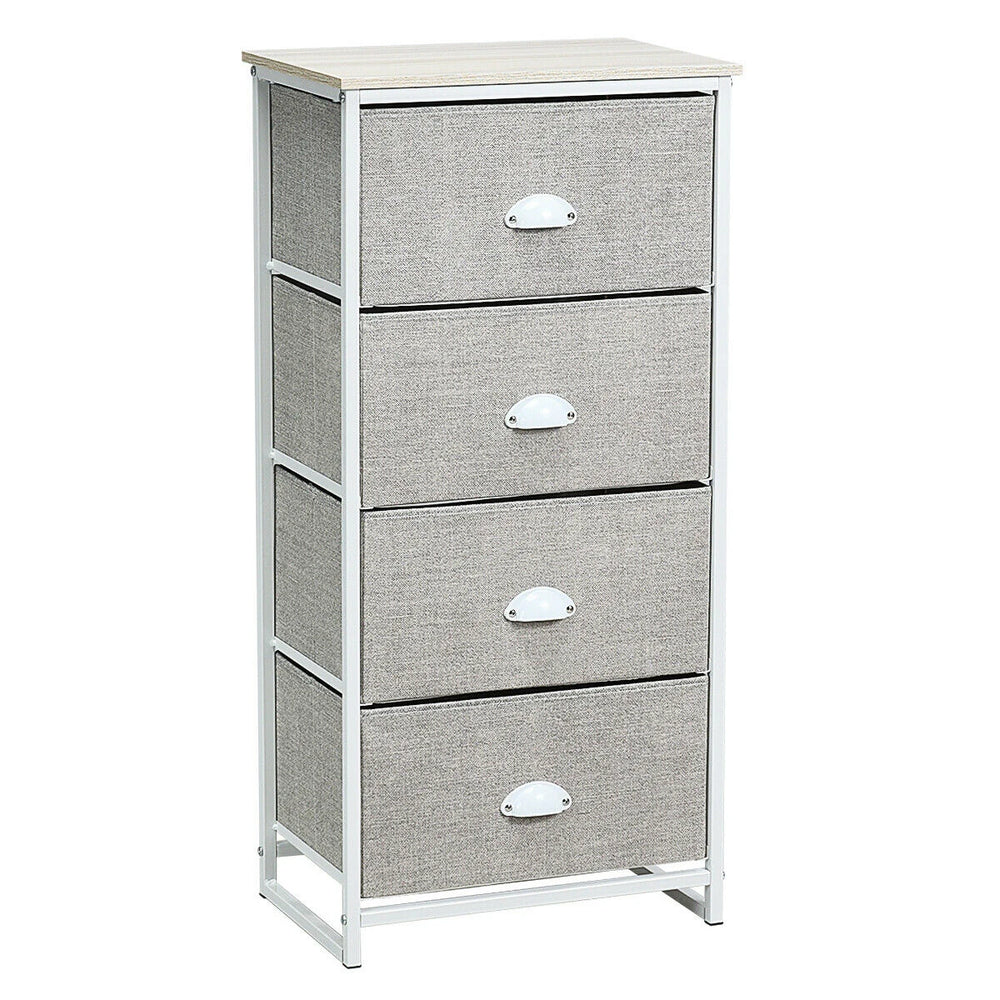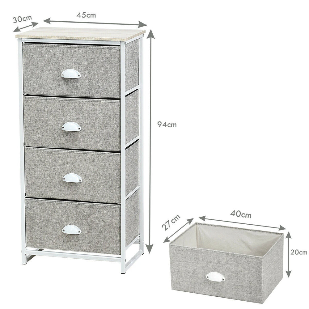 Four stacked fabric drawers offer substantial storage while keeping a small footprint; ideal for tight bedrooms, living areas or offices.