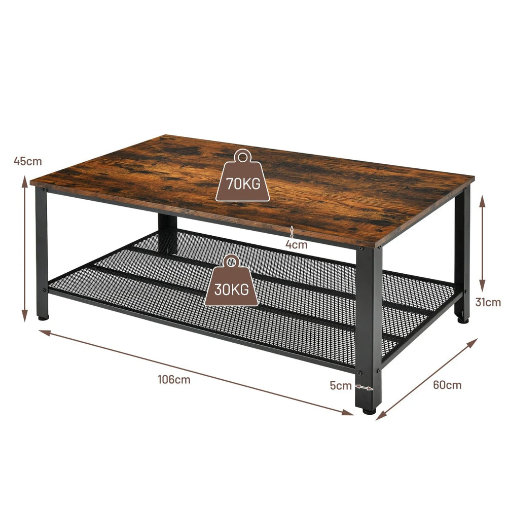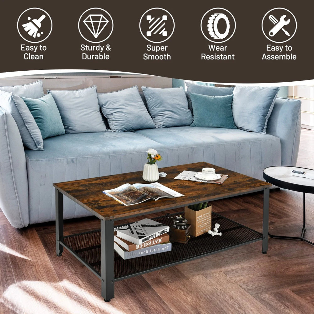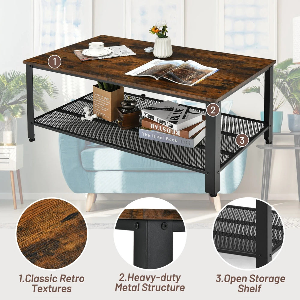 Metal Frame Wood Coffee Table Console Table with Storage Shelf-Rustic Brown