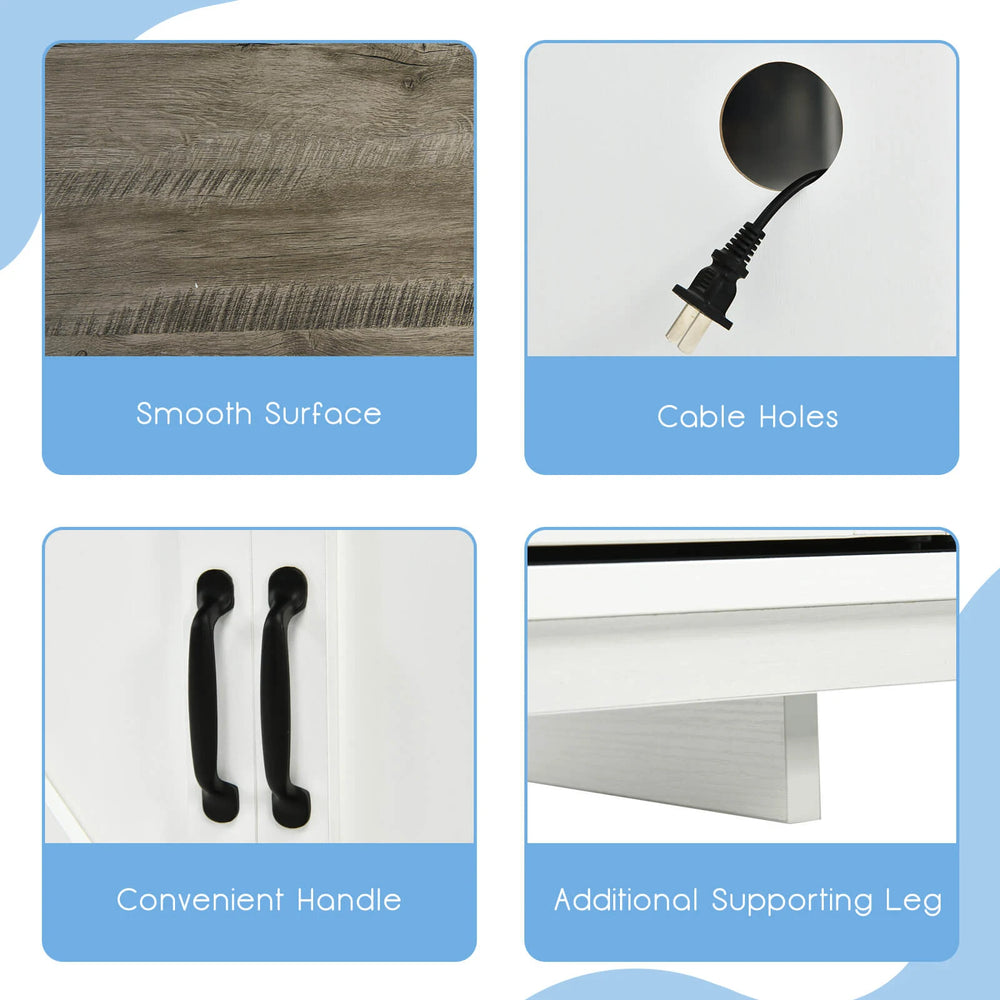 Want both a TV tray and a cabinet? The TV stand for 65 television is designed to achieve this. Made of safe and environmental chipboard, this TV table is durable and beautiful. Because of the high-quality material, this TV ark is easy to clean and maintain. Except for that, featuring a stable structure with large weight capacity and ample storage space with two open center compartments and two cabinets, this TV stand will definitely give you better-using experience. It is worth mentioning that this TV cabinet adopts a sliding barn door design, which allows you to adjust the door position according to your own needs, but also adds an aesthetic feeling of this TV ark. Bullet Point: Fits up to 65 TVs: Equipped with a wide tabletop, two open center compartments and two cabinets, this TV cabinet offers ample storage space for you. For the spacious table top, it is perfect for placing a 65TV, photo frames, plants, and other items you may have. Besides, the two open center compartments and two cabinets design offer extra space for you to store your belongings. Beautiful Appearance with Sliding Barn Doors: Not only does the sliding barn door design allow you to adjust the door position according to your own needs, but also adds an aesthetic feeling of this TV ark. Other than that, this TV ark has clear wood grain, which is beautiful and suitable to any decor of your bedrooms or living rooms. High-Quality Wood Material: Made of melamine decorative laminate, the top board has good toughness and is difficult to deform. In addition, the other boards are made of chipboard, which is durable and waterproof. Most importantly, these boards are produced according to P2 standard, which is totally safe and environmental. Stable Structure with Large Weight Capacity: Not only do the sideboards adopt a strong frame structure, but also two barn doors use frame structure, which ensures the stability and large weight capacity of the TV bench. As for top board, it can hold up to 50kg items. And for sideboard, it can hold up to 20kg items. Easy to Clean and Maintain: Because of the high-quality material, this television stand is dustproof and wear-resistant, which makes it easy to maintain. At the same time, the television table is easy to clean. Even though it is stained, you can just wipe it with a cloth and it will be clean again. Features: Made of high-quality chipboard, wear-resistant and difficult to deform Sliding barn door design, beautiful and practical Conform to P2 standard, safe and environmental Stable structure with a large weight capacity Ample storage space with two open center compartments and two cabinets Natural and beautiful appearance with clear wood grain Ideal for 65 television, perfectly fit your bedrooms, living rooms and other furniture Easy to maintain and clean Specifications: Color: White/Grey Material: Melamine decorative laminate + ghipboard Overall dimension: 147 cm x 40 cm x 60 cm ( L x W x H ) Net weight: 32kg Weight capacity: 50kg Package includes: 1 X TV stand 1 X User guide