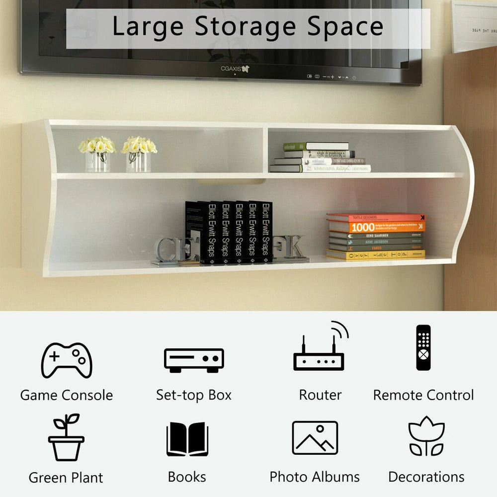 Color: White Material: P2 standard particleboard & MDF Overall dimension: 48" x 16" x 16"(L x W x H) Net weight: 39.6 lbs Weight capacity: 120 lbs tabletop 50 lbs each compartment 80 lbs bottom shelf Package includes: 1 x Wall-mounted TV console