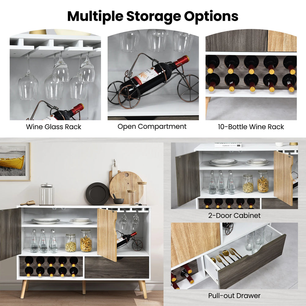 Designed for those who enjoy wine at home, the unit includes a built-in wine rack that holds up to ten bottles, plus a wine glass holder and an open shelf for frequently used items. A large drawer and a cabinet with an adjustable shelf make it simple to store cutlery, glassware and taller utensils.