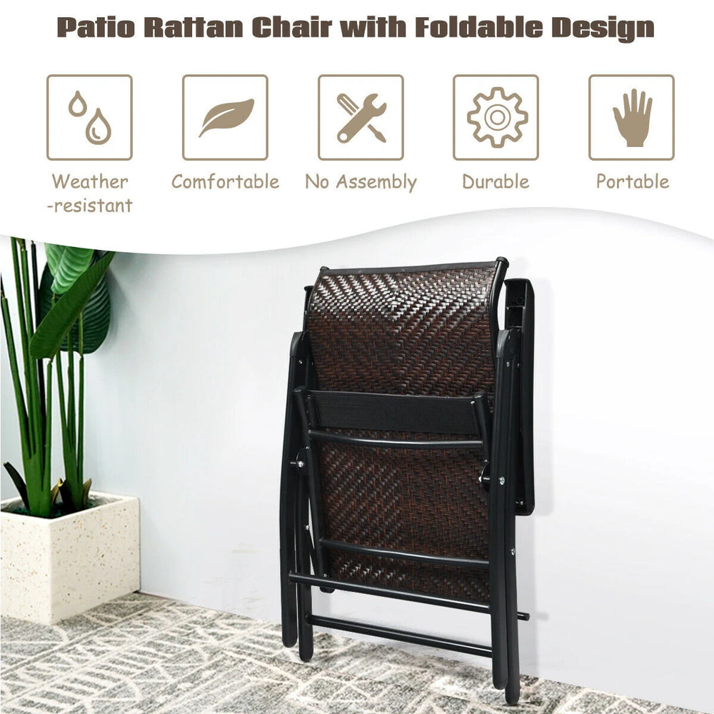 These 2 pieces folding rattan chairs are perfect for indoor or outdoor leisure time with your family or friends in the backyard, garden, poolside and more. Made of a high-standard steel frame with a powder-coated finish, this chair has high stability and strong durability. The premium PE rattan material is durable enough to support large weight capacity. Whats more, the backrest can be adjusted according to your different needs. Coming with a foldable design, the patio chair set can be easily stored without taking too much space. At the same time, the lightweight chairs can be put in the trunk for travel. Modern and concise style can well match with different kinds of furniture on your patio. Bullet Point: Solid & Durable Material: Made of a high-standard steel frame, this chair ensures strong stability and large bearing capacity. And the PE wicker is durable and weather resistant, which is not easy to damage and can be used for a long time. Whats more, the protruding screws are wrapped in a protective cap that won't scratch your skin. 5-Level Adjustable Reclining: This outdoor chair has 5 adjustable backrest positions, allowing you to choose ideal positions from sitting up to reclining. Lifting the armrest and securing it to the position which is most comfortable for your back, you can totally slow down and enjoy your leisure time. Foldable & Compact Design: Adopting the foldable design, you can put the patio chairs in a folded frame to avoid occupying the space available on the site. Whats more, this lightweight chair with a foldable design makes it convenient for you to carry and move. When you need chairs for outdoor activities, this chair set is a great choice for you. Ultra Comfortable Sitting: The widened armrest of this rattan chair can support and rest your hands to relieve the pressure. A high backrest has an ergonomic curve, helping your head and body to be comfortably placed in this well-designed chair. Besides, the one-step forming rattan surface has great breathability which will not let you feel stuffy even in the hot weather. Ideal for Various Places: Featuring a stylish and simple design, this rattan chair set can fit well with various kinds of furniture. Our outdoor folding chair is perfect for any indoor and outdoor use such as cafes, bars, gardens, patios, porch, and poolside. Pair this chair set with a rattan table, this furniture set will be the highlight of your patio. Features: 5 adjustable positions meet you're a variety of needs Durable and weather-resistant PE rattan provides a long service life Heavy-duty steel frame in triangular structure for large load-bearing capacity One-step forming rattan surface for cozy sitting experience The backrest and widened armrest have an ergonomic curve for good support Foldable & portable design for easy storage and transportation Anti-slip mats at the bottom strengthen the stability of the chairs Ideal for patio, backyard, bars, cafes, and garden Perfect for a family gatherings, party, and outdoor camping No assembly is required and easy to clean Specifications: Rattan color: Brown Steel color: Black Material: Steel, rattan Overall dimension: 69 cm x 58 cm x 85-112 cm (L x W x H) Distance from armrest to floor: 70 cm Distance from seat to floor: 44 cm Folding dimension: 54.5 cm x 90 cm x 14 cm (L x W x H) Net weight of each chair: 7.5 kg Max weight capacity: 120 kg Package includes: 2 x Rattan folding chairs