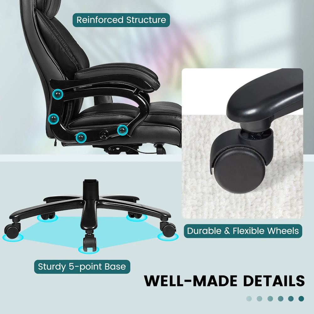 Specific information Maximum load: 180 kg Materials: metal, PU, PVC Colour: black Assembly: required Dimensions Width: 72 cm Depth: 81.5 cm Height: from 116 to 123 cm Weight: 22.7 kg