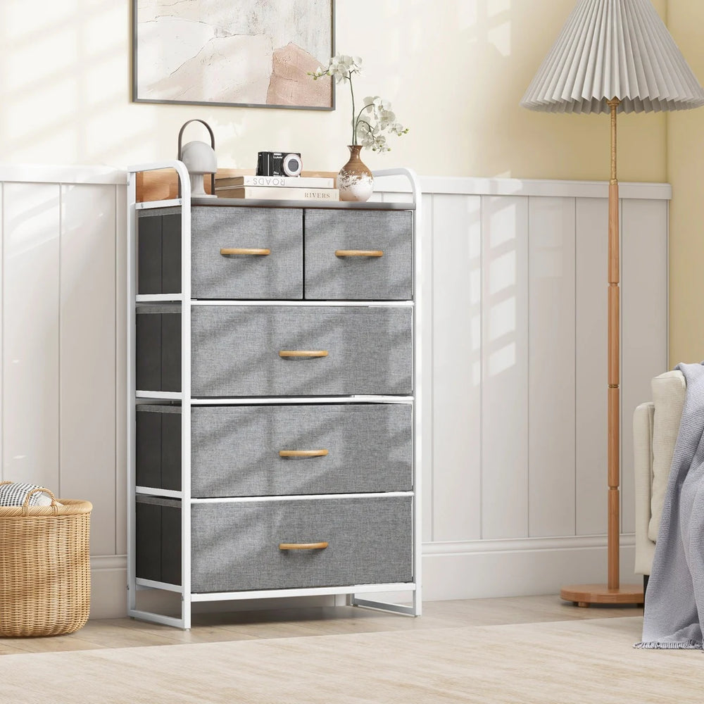 A multifunctional and nice-looking organizer unit for your home! This dresser storage tower with 4/5 foldable drawers will organize your items in good order to maximize your space and make your room tidy. High-grade fabric drawers can keep things in good condition and are more durable. The modern style allows the dresser to blend with any home decor easily. It is perfect for bedrooms, nursery rooms, laundry rooms, living rooms, hallways, closets, etc. As for the quality, the cabinet is made of sturdy steel frame and durable MDF top, ensuring strong stability and long-lasting use. And the wooden top is smooth and waterproof for easy cleaning. Featuring a lightweight and compact design, this 4-drawer dresser chest stand is portable, and easy to move and assemble. If you are looking for such a product, don't hesitate to place an order! Large Capacity and Premium Fabric: Equipped with 4/5 foldable and removable drawers of 2 different sizes, this dresser provides large space for you to store items by type, including clothes, toys, scarves, socks, etc. to make your room neat. Moreover, the drawers are made of high-quality fabric, which is breathable, non-toxic and durable. Sturdy Iron Frame and Wooden Top: Supported by a heavy-duty iron frame, this closet cabinet ensures great sturdiness without any wobbliness. The adjustable foot pads can protect the floor from scratches while enhancing stability. Besides, a spacious and waterproof wooden top provides a safe place for holding cups, plants, clocks, etc. Chic and Practical Home Organiser: This 4/5-drawer storage dresser combines utility function with an elegant look, which makes it an ideal addition to your home. And this drawer tower only takes up small space while providing plenty of storage space, which can work anywhere in your home, like bedroom, nursery room, living room, or entryway. Thoughtful Details and Easy to Move: Each drawer is equipped with a solid wood handle for opening and closing more easily. The anti-toppling device and anti-drop blocking plate provide added stability and safety. Moreover, thanks to the lightweight design and rounded handle, you can move the dresser conveniently anywhere. Easy to Maintain and Install: Thanks to the waterproof wooden top and washable fabric drawers, this chest of drawers is easy to clean with a damp cloth. According to the detailed installation manual included, you can easily finish the assembly of this storage unit.