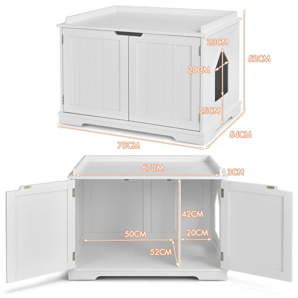 This cat house offers your cat a private and safe place! There is space for litter boxes and cat food. The adjustable partition wall meets different needs. In addition, it is made of high quality MDF, and it is of good quality, strong and durable. Its load capacity is 50 kg. The painted surface is wear-resistant and waterproof. In addition, cats can easily enter and exit the house via the entrance, and the semi-closed structure ensures good air permeability. The top is equipped with a shelf with raised edges that can be used to store magazines, flower pots, lamps, etc. So it is not only a cat house, but also a side table and storage shelf, as well as suitable for living room, bedroom, study, etc. Bullet Point:Safe and Sturdy MDF Material: This cat house is made of high quality MDF, which is environmentally friendly, safe and durable. In addition, the painted surface is waterproof and wear-resistant. Its load capacity is 50 kg. In addition, the door is very easy to open and close.Breathable House: Cats are creatures who love to drill holes. There is a hole on the side of this cat house, so cats can go in and out freely. In addition, the semi-closed design means it is very well ventilated, which is beneficial for the cat's health.Developed for Cats: In the cat house, the cat has privacy and can feel safe. With a size of 75 x 54 x 52 cm, it is large enough to accommodate the litter box in it. In addition, the partition can be adjusted. You can move or dismantle it as needed.Multifunctional Cat House: The top of this cat house is equipped with a shelf with raised edges that can be used to place magazines, flower pots, lamps, etc. It can also be used as a side table and storage shelf. The simple appearance makes it ideal for the living room, bedroom, study, etc.Easy Assembly and Cleaning: Thanks to all the accessories and detailed instructions, you can assemble this cat house quickly. In addition, the smooth surface is waterproof and easy to clean. All you have to do is wipe them with a damp cloth. Features:Made of high quality MDF, safe and durable Painted surface is waterproof and wear-resistant Large entrance for cats to get on and off freely Semi-closed design for good breathability Provides space for a litter box and cat food Adjustable partition for different needs Tray with raised edges for plants, photo albums, magazines, etc. Suitable for living room, bedroom, study, etc. Easy to assemble and clean Specifications: Color: Black/White Product size: 75 x 54 x 52 cm (L x W x H) Material: P2 MDF Net weight: 14.5 kg Load capacity of the top: 20 kg Load capacity of the base plate: 30 kg Product include:1 x Cat house 1 x Instruction