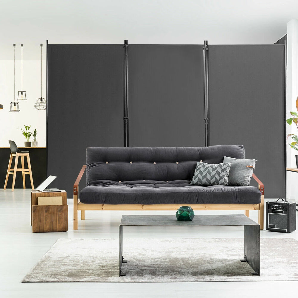 This 3-panel folding room divider provides a quick, attractive way to create privacy or define zones within a room. Each panel is covered in durable polyester fabric stretched over a solid steel tube frame, giving a clean, modern look that suits home or office environments.