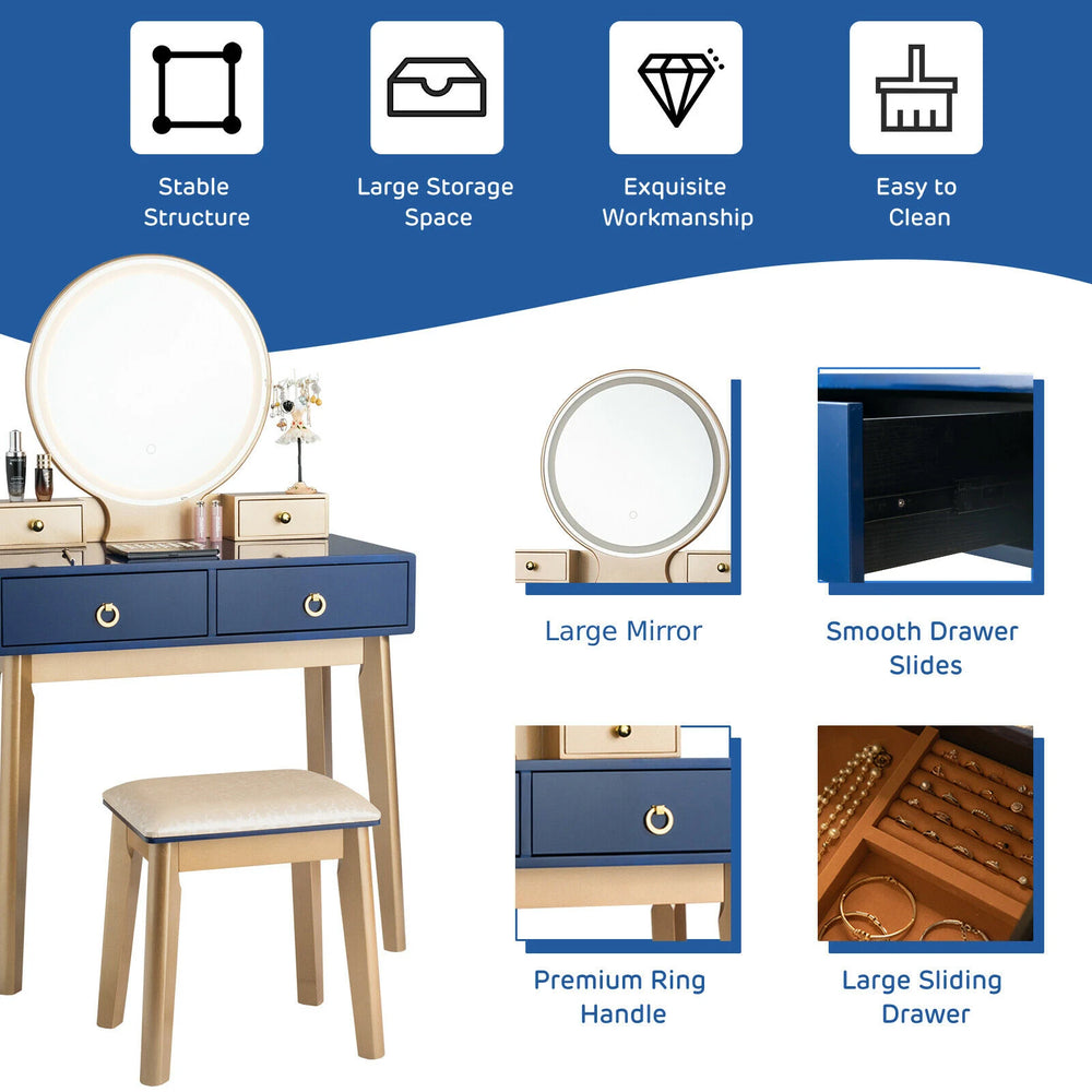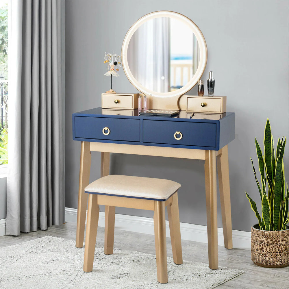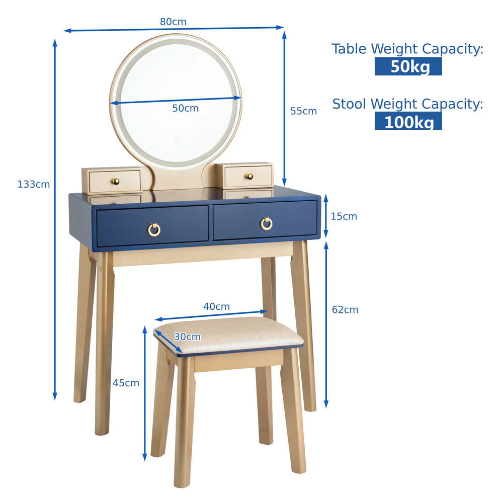 Modern Dressing Table with LED Mirror & Cushioned Stool-Blue