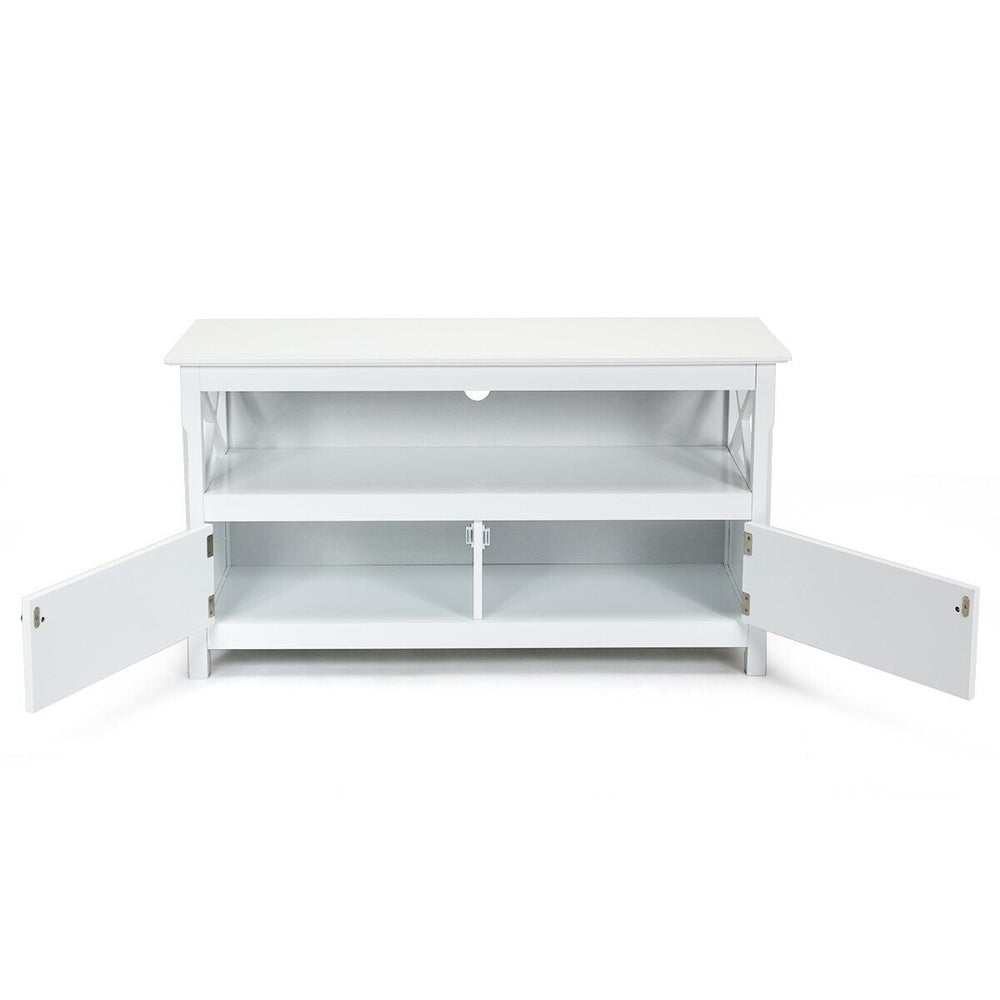 Are you feeling trouble in cannot find a suitable TV stand to place your television or other media devices? Dont worry, this practical TV stand with contemporary style can help you solve this problem. Made of premium wood, this TV stand is sturdy and durable, providing a lifelong and reliable use. The 2 cupboards and a display shelves provide large space for placing TV remotes, books, magazines, photo albums or other items. And there is also a secluded hole in the back board for many wires to thread. It also features a bright white appearance and X-shape wooden baffles on both sides, bringing modern style to your living room and blending well with any home decor. Not only this cabinet can be placed in living room but also in other place like bedroom, kitchen and bathroom to help you to store different sundries. The pieces of this furniture are easy to assemble with tools by yourself in short time. Dont hesitate to buy it. Bullet Point: To Meet Diverse Needs: The media console table is perfect for multi-scene use. In the living room, its wide tabletop can accommodate a TV up to 50 inches. Meanwhile, it is also suitable for the entryway, bedroom, study room or office, serving as a storage console, an entertainment center, a display cabinet. Ideal Storage Solution: The entertainment center provides great storage, since it is designed with a spacious tabletop, an open shelf and 2 large doors. You can keep a lot of items in a tidy way, such as sound bars, media equipment, CDs, DVDs, books and so on. Also, it has a cable management hole to avoid messy wires. Reliable Construction: Thanks to high-grade MDF and solid pine wood, the media console table features a strong load capacity of 176lbs. Besides, its structure is reinforced, so the overall stability is perfectly ensured for the long-time use. More, there are X-shaped frames on both sides for better sturdiness. Charming Appearance: The TV cabinet features a pure color and sleek lines which highlight a simple and modern design. Thus, it can blend well into different home decorations in a harmonious way. Also, since its overall surface is smooth, you just need to wipe it regularly for the daily maintenance. Hassle-Free Installation: The entertainment center comes with a detailed manual as well, which clearly explains each step. Thus, you can easily figure out how to assemble the112 x 40 x 61 cm (L x W x H) media console table. Also, the entire process won't take much time. Features: Spacious storage space with open shelf and closet A hole in the back for wires threading Exquisite knobs for easy opening and closing X-shape baffles to prevent things falling down To keep your sundries and media devices in order A great addition to fit your living room, kitchen, bedroom or bathroom Assembly easily by yourself in short time Specifications: Color: Black/White/Brown/Grey Material: Wood Overall dimension of TV stand : 112 x 40 x 61 cm (L x W x H) Cabinet dimension: 99 x 36 x 19 cm (L x W x H) Net weight of TV stand: 22 kg Weight capacity of TV stand: 80 kg Package Include: 1 x TV Stand 1 x User Guide