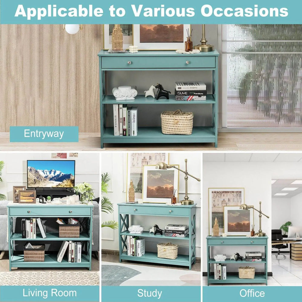 Console Table 3-Tier with Drawer and Storage Shelves-Turquoise