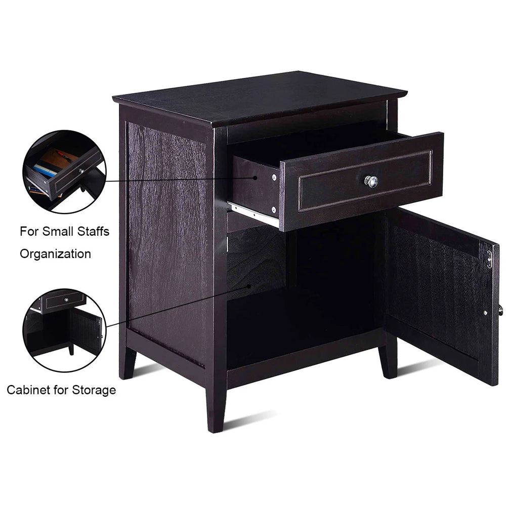 Color: Dark Brown Material: MDF + Pine Wood Overall Dimension: 19" x 15" x 25" (L×W×H) Net Weight: 21lbs Weight Capacity of Tabletop: 66lbs Weight Capacity of Cabinet: 22lbs Weight Capacity of Drawer: 11lbs Package Includes: 1×End Table 1×User’s Manual