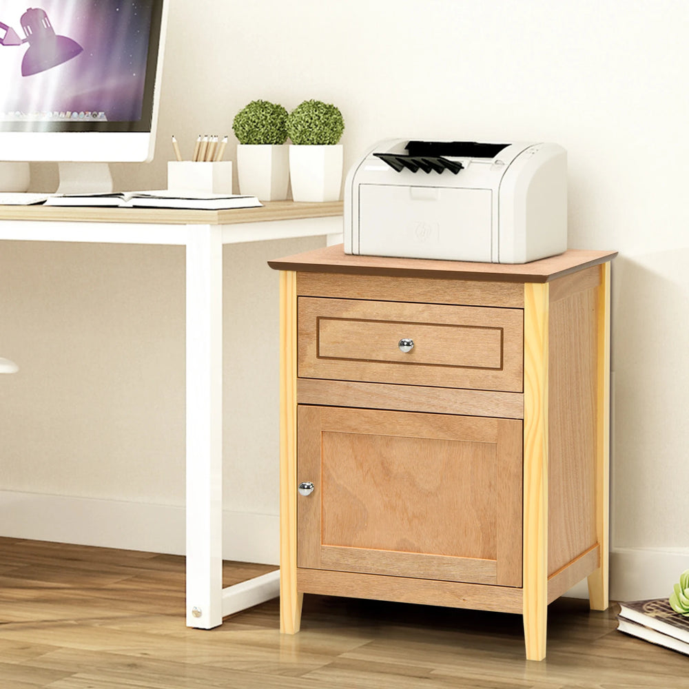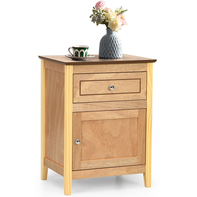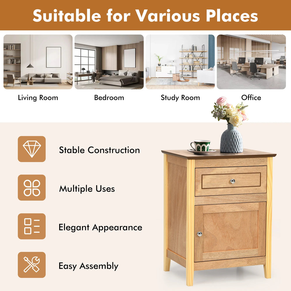 Color: Natural Material: MDF + Pine Wood Overall Dimension: 19" x 15" x 25" (L×W×H) Net Weight: 21lbs Weight Capacity of Tabletop: 66lbs Weight Capacity of Cabinet: 22lbs Weight Capacity of Drawer: 11lbs Package Includes: 1×End Table 1×User’s Manual