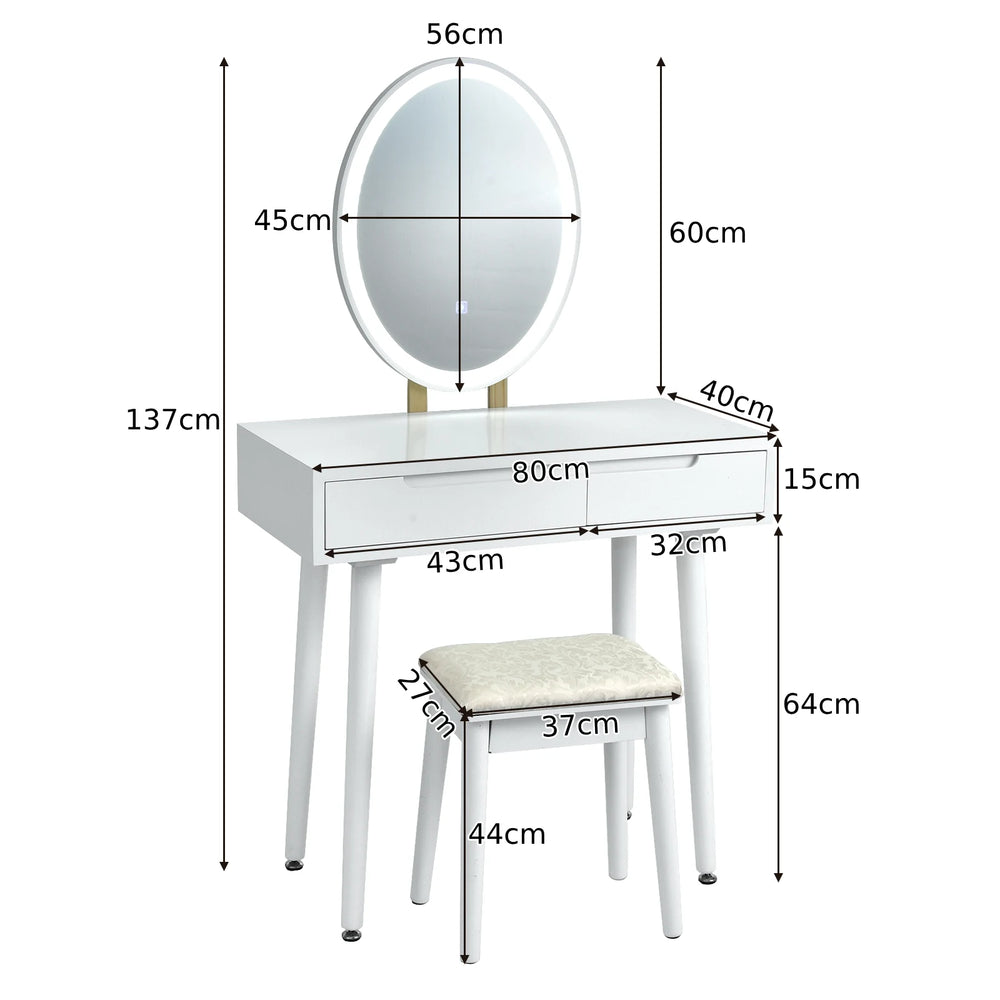Color: WhiteMaterial: MDF + Rubber Wood + Cedar WoodOverall Dimension: 80 x 40 x 137cm (L x W x H) Stool Dimension: 37 x 27 x 44cm (L x W x H) Mirror Dimension: 45 x 56cm (L x H) Weight Capacity of Table: 20 kgWeight Capacity of Stool: 100 kgNet Weight: 19 kg