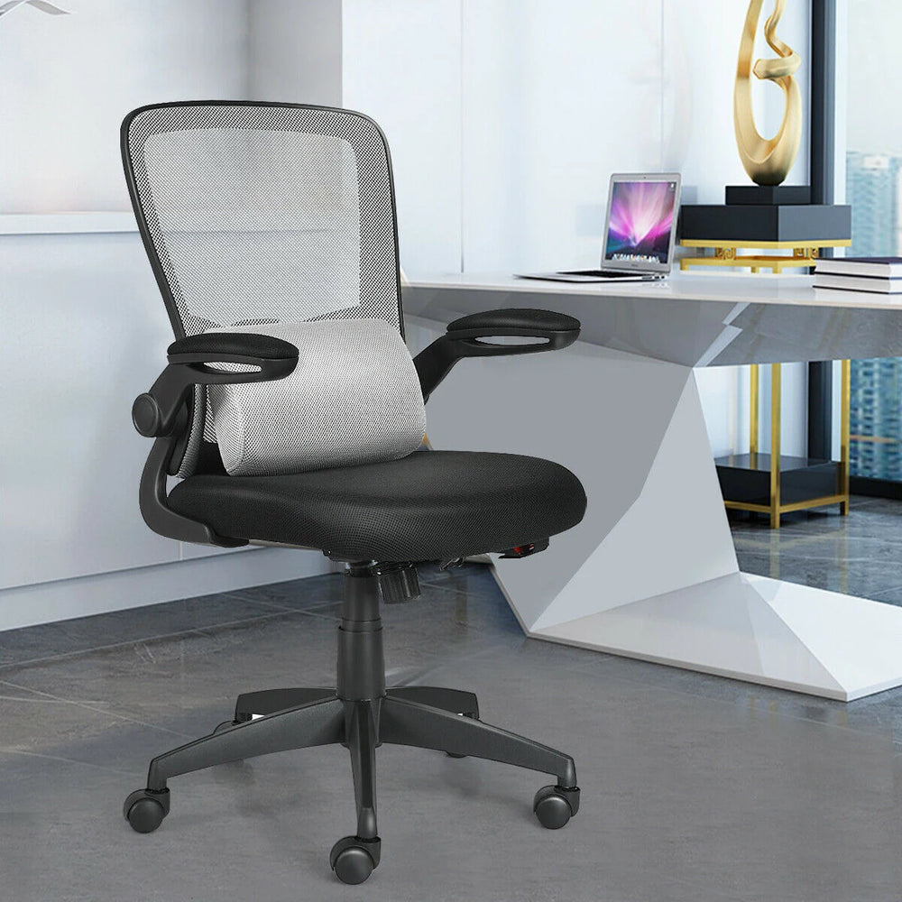 Do you want a sturdy office chair that can greatly relieve your sedentary fatigue? The mesh office chair can be your good choice. Made of high-quality material, the heavy duty chair base effectively ensures overall sturdiness and improves weight capacity up to 126 kg, which undoubtedly offering you a stable sitting space. Plus, the mesh office chair is covered by soft sponge and breathable mesh both of which effectively improve your comfort. And there are other features practical for users. On the office chair, there are three adjustable parts, the height, the backrest and the armrest. With adjustable backrest, you can comfortably lie down during break. With flip up armrest, you can easily and perfectly place the chair under the table for saving space. With pneumatic control, you can easily choose your favorite height. If you like this mesh office chair, please order it right now! Bullet Point: Ergonomic Backrest: Different from other office chair, the backrest of the mesh chair can fit well against your back, which definitely increases contact area, and can better support your back. Plus, there is a lumbar support on the chair. This way, even if you are sedentary, you will not feel very tired. Adjustable Setting: Thanks to adjustable height, the mesh office chair is suitable for diverse people of different sizes. What’s more, the armrest is also designed to be adjustable from 0° to 90°, which makes the chair more space-saving and allows you to perfectly place the chair under the office table. Premium Material: The overall framework is made of fairly sturdy material that highly enhances the whole load-bearing capacity up to 126 kg. Besides, all areas in contact with you are padded with soft foam and covered with breathable black mesh, which greatly improves your comfort. Easy Assembly and Wide Application: We have provided you with all required accessories and detailed manual in the package, so you can finish assembling effortlessly. After assembling, the complete mesh office chair can be used as working chair, gaming chair or reading chair according to your needs. Convenient Movement: Equipped with four 360° swivel wheels, you can conveniently move the chair from one room to another room. Moreover, as the mesh office chair is also very lightweight, it will be much easier for you to move the chair. Features: Effortless to move as its light weight Flip up armrest saving you a lot of space Heavy duty base ensuring overall stability Adjustable design that helps you find appropriate height Premium 360° swivel wheel protecting the floor from being scratched The incline of the chair from 90 – 120 °, allowing you to sit comfortably during working Ergonomic backrest perfectly fitting your back and improving your sitting experience