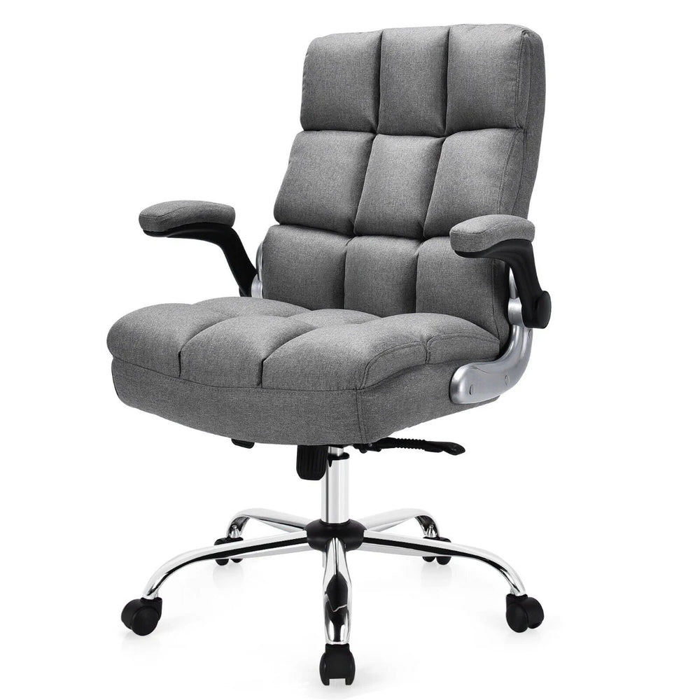Practical details include padded flip-up armrests for flexible arm support and a compact seat footprint that fits most desks. The neutral grey linen finish is designed to blend with modern décor while remaining easy to maintain with routine care.