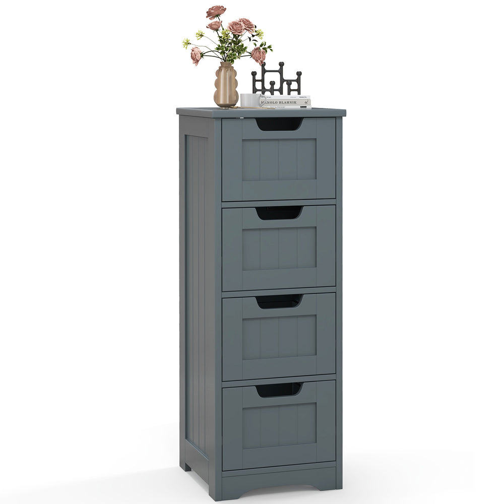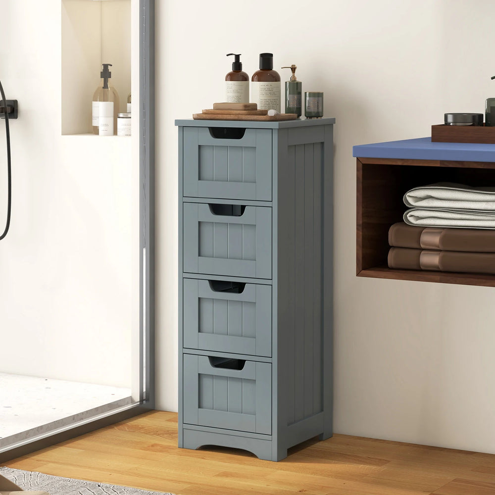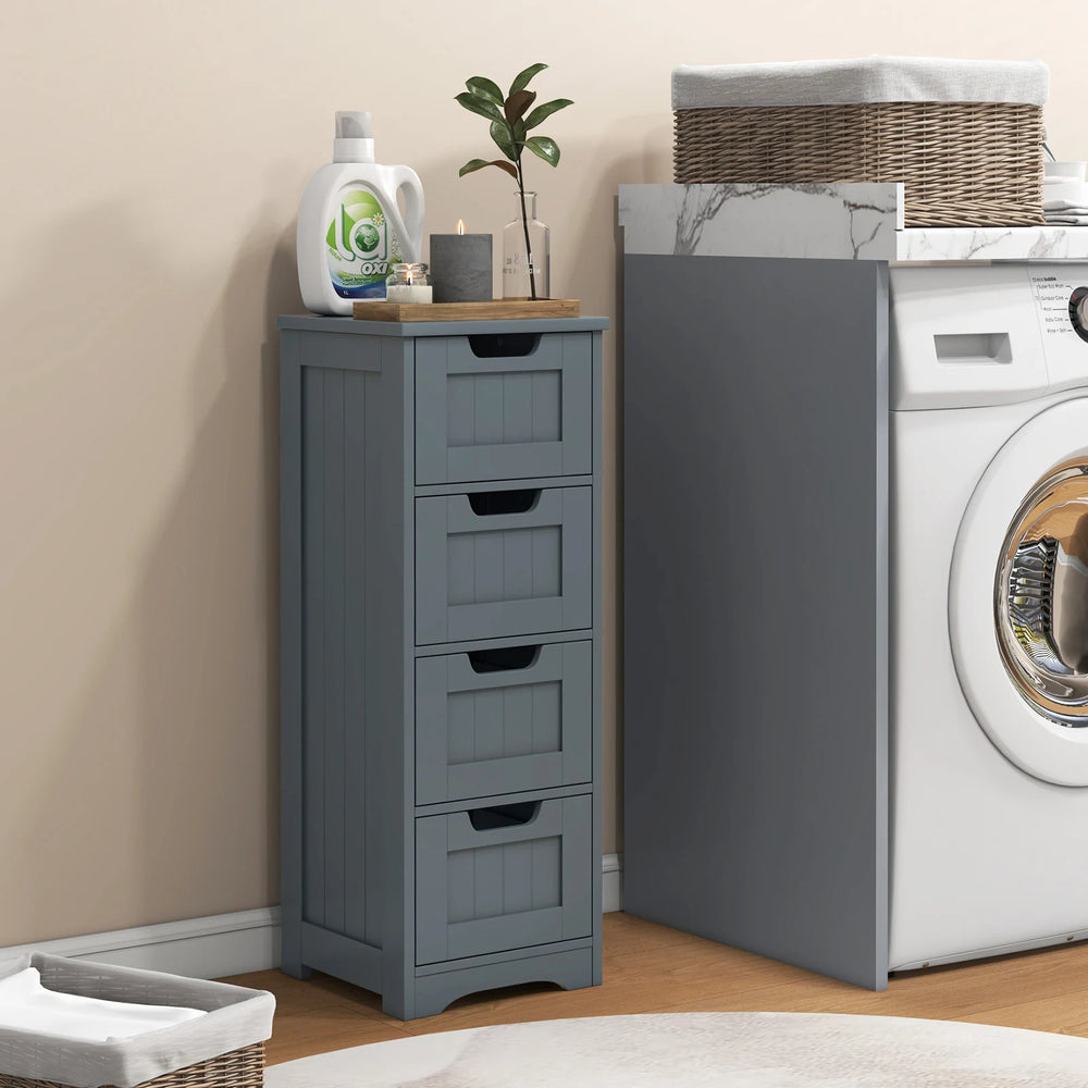 This bathroom floor storage cabinet with 4 drawers is ideal for your bedroom, bathroom, living room, office and more. The tabletop can hold your books, lamps and so on, and 4 deep drawers provide ample storage space for your hygiene items, toiletries, medications and other household accessories, which make your home more neat and tidy. Besides, high quality MDF material ensures long time service. The storage cabinet can hold a maximum load capacity of up to 110lbs, and each drawer can hold up to 11lbs. Moreover, the back of this cabinet is equipped with anti-toppling devices to fix to the wall for safe use. This versatile floor cabinet is great for any home style and helps to keep your home perfectly organized. Ample Storage Space: Featuring 4 large drawers, this freestanding storage cabinet provides ample space for books, clothes, towels and other daily supplies, which are suitable for your private items. Each drawer measures 10x10.5x7(L x W x H). And the tabletop can accommodate lamps, photo frames, snacks and more. Cutout Handle Smooth Rails: Each drawer is designed with a cutout handle, so that you can open and close the drawer easily. In addition, the smooth slides allow you to access the items in the inner position without effort, and the stopper can protect drawers from accidental falling. Premium Material Sturdy Frame: This bathroom cabinet is constructed by premium MDF, which features great sturdiness and durability to support a long service life. Besides, there is an anti-toppling device on the back of the cabinet, which not only improves overall stability, but also protects your family from accidental injury. More, the tabletop can support up to 110 lbs, and each drawer can hold up to 11lbs. Versatile Floor Cabinet: With clean lines and classic style, this floor cabinet can match well with any furniture style and adds a sense of elegance to your home. Overall dimension: 12x12x33 (L x W x H), the compact size allows you to use it as a bathroom cabinet or side table in your study room, living room, bedroom, bathroom and so on. Easy to Assemble Maintain: Comes with detailed instruction and necessary hardware, this bathroom floor storage cabinet can be assembled in a short time to save your time and energy. Besides, the smooth surface is waterproof, making it easy to clean with damp cloth.