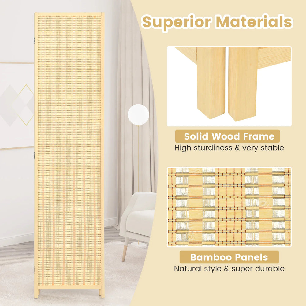 This freestanding 4-panel room divider is crafted from natural bamboo panels framed in durable pine wood, bringing a warm, organic look to living spaces. The tightly woven bamboo provides effective privacy while preserving airflow and a light-filtering aesthetic.