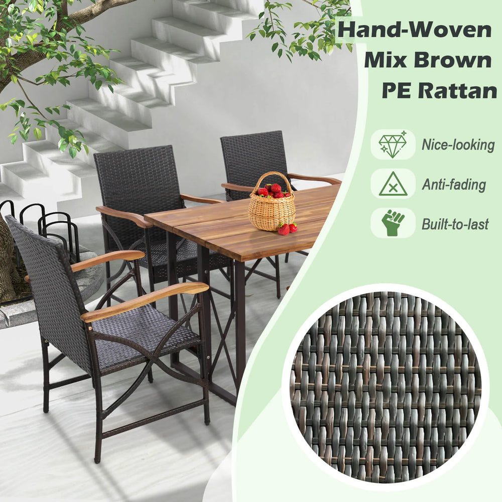 Color of PE Rattan: Mix Brown Color of Cushion: Off White Material: PE Rattan, Metal, Polyester, Spray-bonded Nonwoven Fabric, Sponge, Acacia Wood Overall Dimension: 24.5" x 22" x 35" (L x W x H) Dimension of Cushion: 19.5" x 18" x 2" (L x W x Thickness) Seat Height: 16" Net Weight of Each Chair: 12 lbs Total Net Weight: 48 lbs Weight Capacity: 400 lbs Package Includes: 2/4 x Rattan Chairs 2/4 x Cushions 1 x Instruction