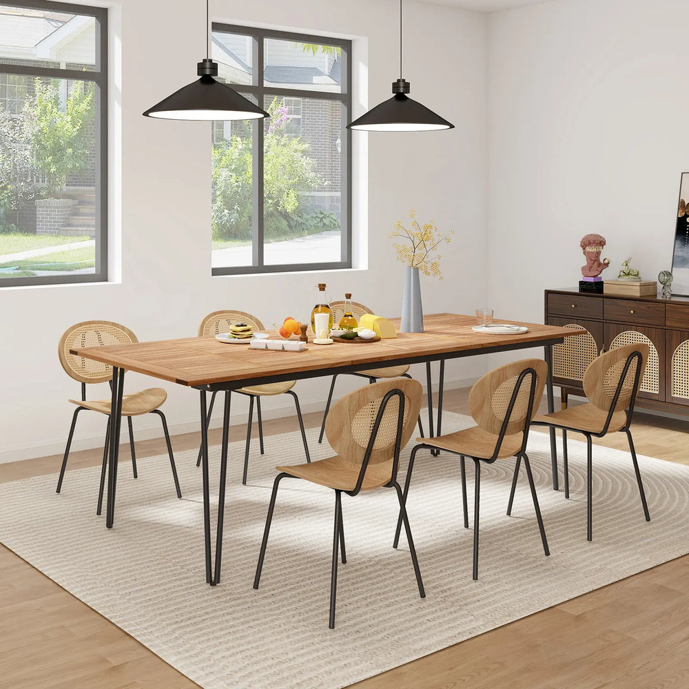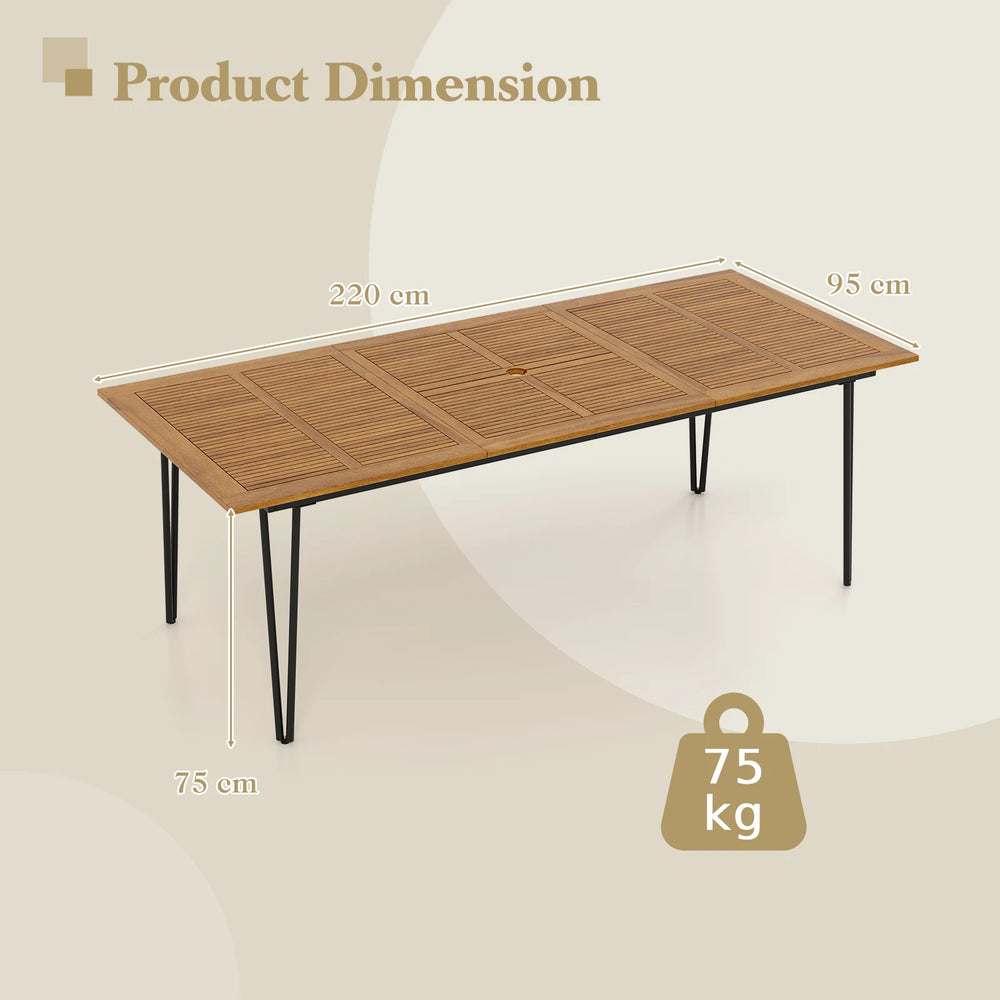 Colour: Natural & Black Material: Acacia Wood, Metal Product Dimension: 220 x 95 x 75 cm (L x W x H) Diameter of Umbrella Hole: 5 cm Weight Capacity: 75 kg Net Weight: 25 kg Box QTY: 1 Package Includes: 1 x Rectangular Dining Table 1 x User Guide