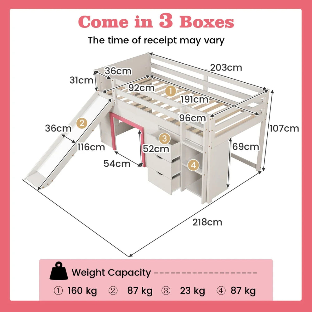 Colour: Beige + Blue/Beige + Grey/Beige + Pink Material: Pine Wood + Plywood + MDF Overall Dimension: 218 cm x 203 cm x 107 cm (L x W x H) Bed Dimension: 191 cm x 92 cm Bed Guardrail Height: 31 cm Guardrail Clearance: 7 cm Entrance Dimension: 54 cm x 52 cm Slide Dimension: 116 cm x 36 cm Weight Capacity of the Bed: 160 kg Weight Capacity of the Slide: 87 kg Weight Capacity of Each Drawer: 23 kg Weight Capacity of the Ladder: 87 kg Net Weight: 80kg Package includes: 1 x Loft Bed Frame 1 x Instruction Manual