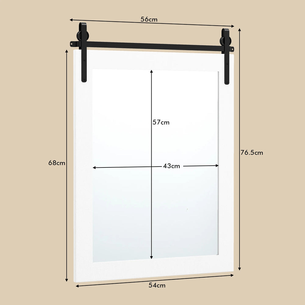 Color: White Material: Solid Wood, Glass, Steel Overall Dimension: 30" x22" (L x W) Mirror Size: 22.5" x 17" (L x W) Thickness of Wood Frame: 0.6" Shape: Rectangle Net Weight: 9 lbs